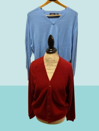 This lot features two Jack Nicklaus golf sweaters, each with its own charm. The vintage red sweater shows signs of wear with light pilling all over, adding character to its classic style. The blue sweater, on the other hand, appears to be unworn, maintaining a fresh and pristine look.