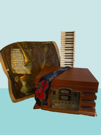 This harmonious collection includes a Crosley radio with FM, phono, and CD player (all in working order; remote needs a new battery), offering excellent sound quality. Also featured are a Dillard practice keyboard, a music-themed wall hanging with violin and trumpet motifs, and a tie adorned with a violin design. Late Addition: mute, two mouthpieces, and pitch pipes complete this delightful musical assortment!