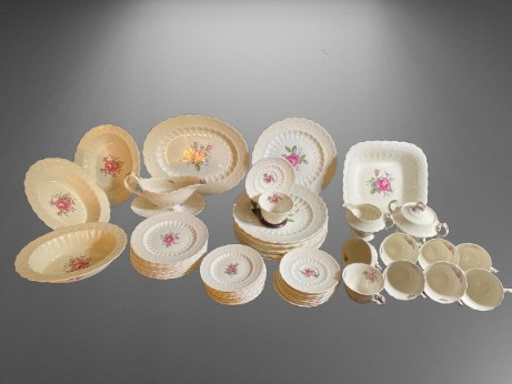 The Spode "Billingsley Rose" pattern is crafted from fine bone china, renowned for its exceptional durability, translucency, and timeless elegance. This high-quality material is a favorite choice for sophisticated dinnerware, offering both beauty and strength for any occasion. The set includes: 1 dinner plate with a chip 9 coffee cups and saucers Cream and sugar 1 square serving bowl (9 3/4" x 9 3/4") 10 salad plates (7 5/8") 10 bread plates (6 1/8") 10 dinner plates (10 1/2") 1 oval platter (13 1/4" x 10 1/4") Gravy boat 3 oval serving bowls (10" x 8")