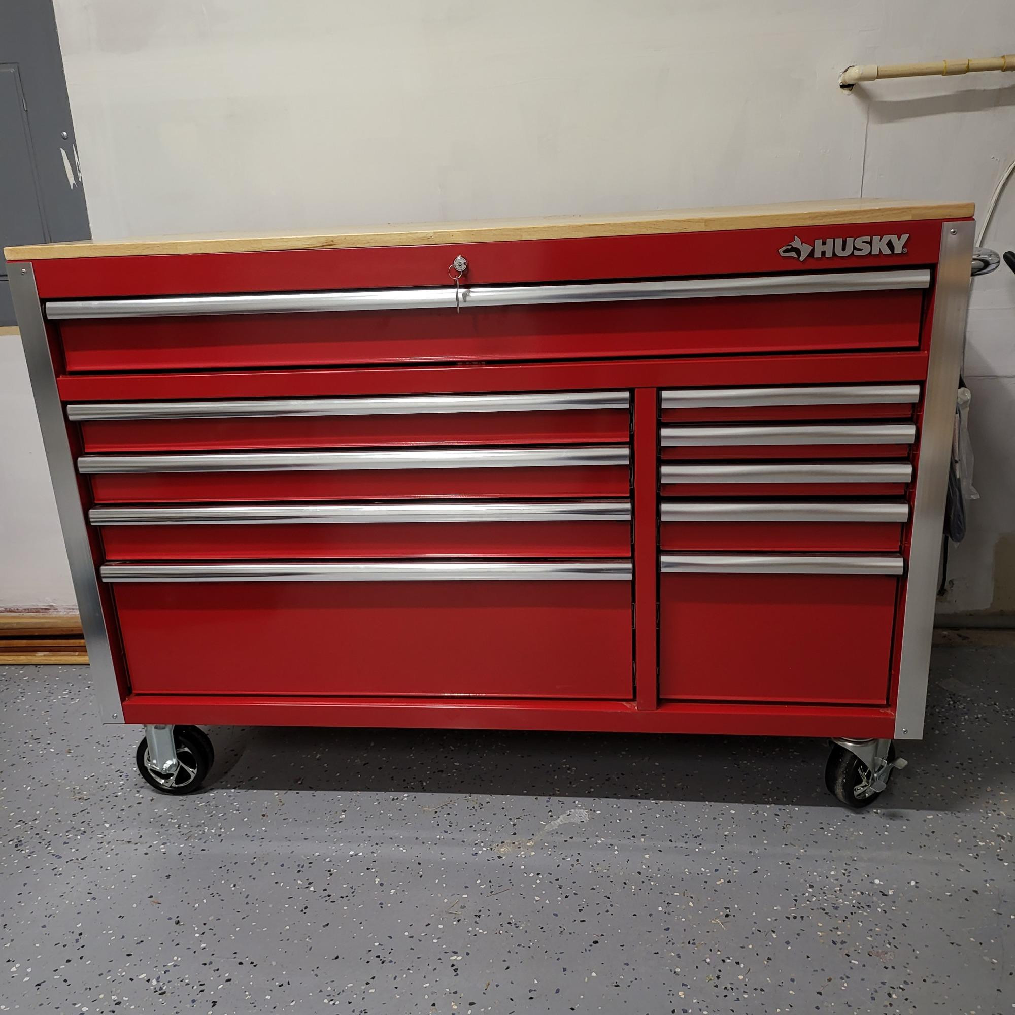Husky 52" locking tool chest with wood work bench top, attached power strip and locking casters. Comes with various tools inside. Key is also included.