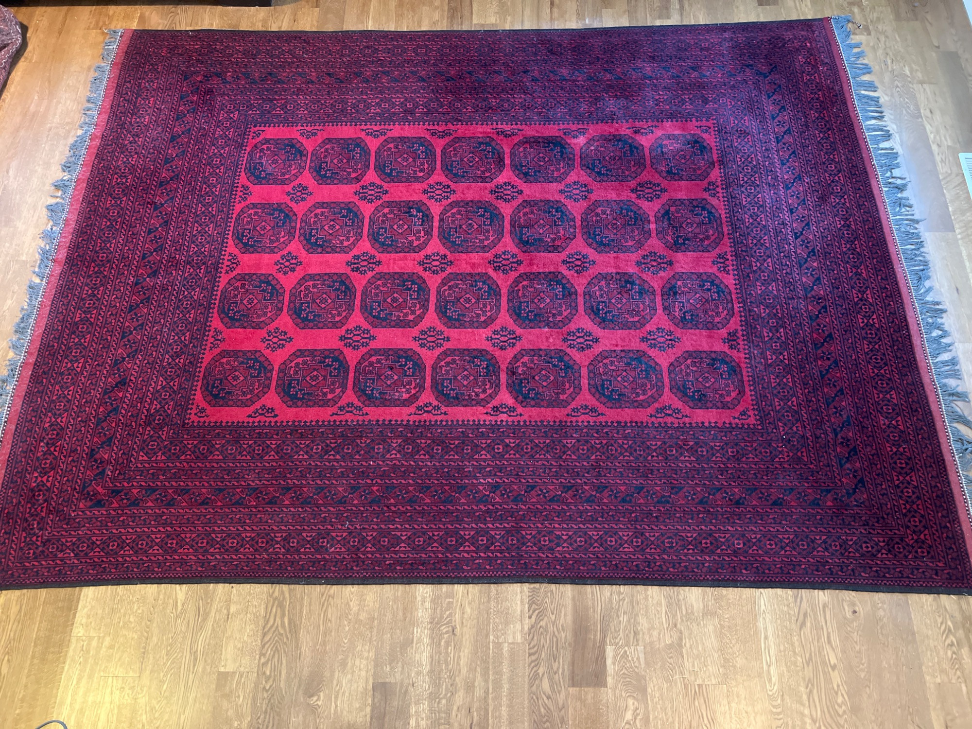 Traditional patterned handmade burgundy and red fringed rug. Large approximately 10 feet x 8 feet.