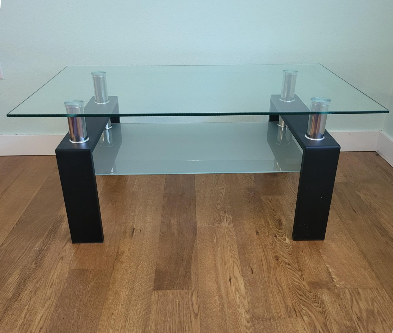 Clear glass top with frosted glass shelf, black powder coated metal & chrome frame.