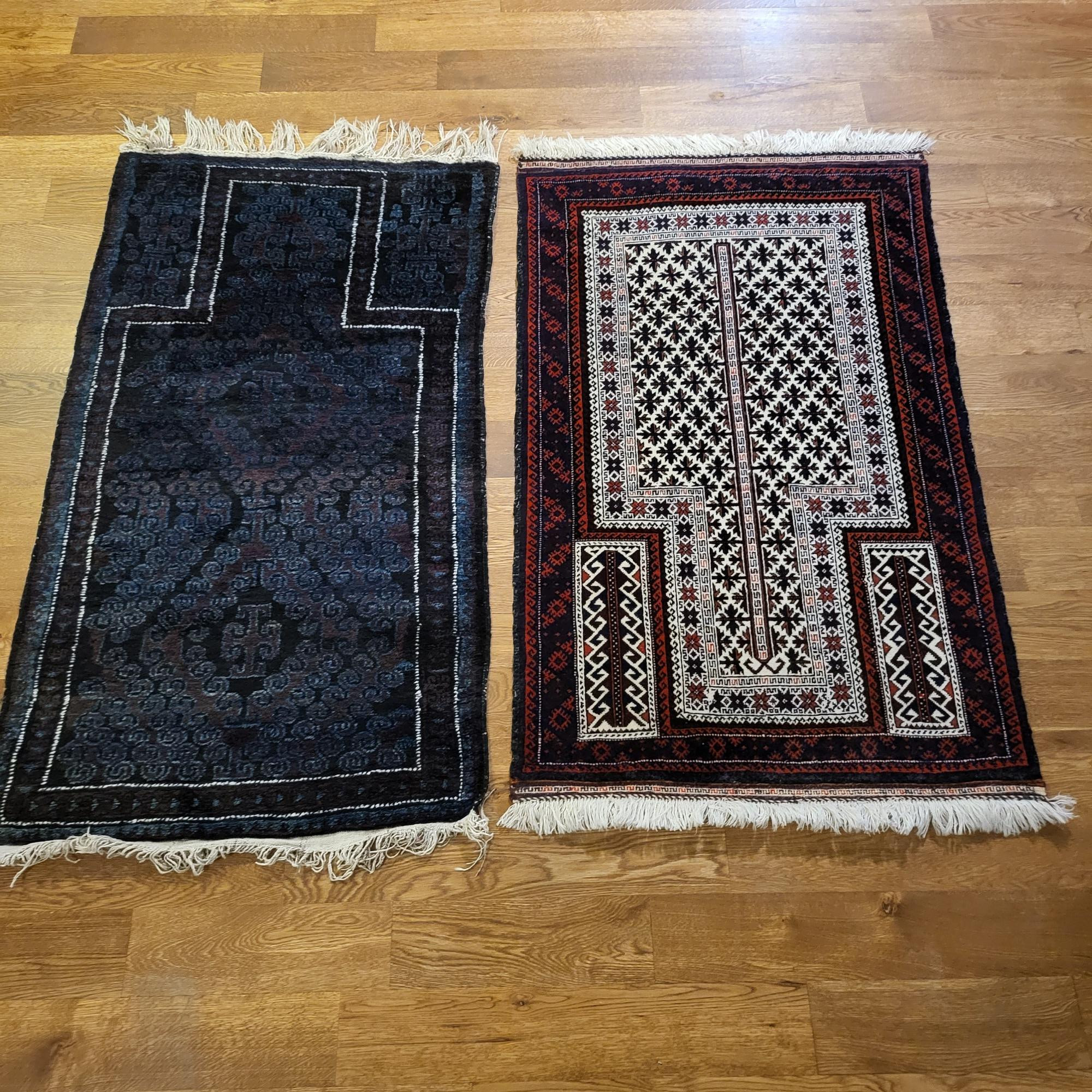 Two geometric design hand knotted wool prayer rugs. Origin is middle east (Turkey, Afghanistan, Iran)? Design and craftmanship is in the style of the Baluch or Baloch artisans, however we do not have documentation to confirm that Baluch people crafted these hand made prayer rugs. Dark blue is 57" x 32" and red one is 55" x 34"..