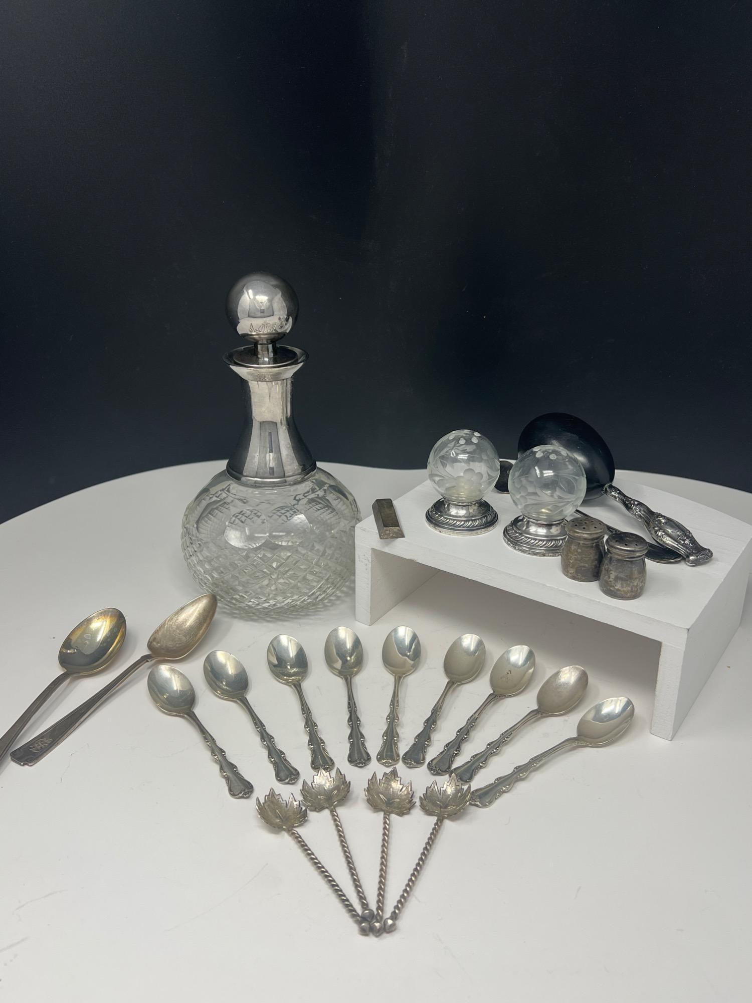 Lot # 33 - Sterling Demitasse Spoons, 999 Silver Bar & Glass Decanter & More
