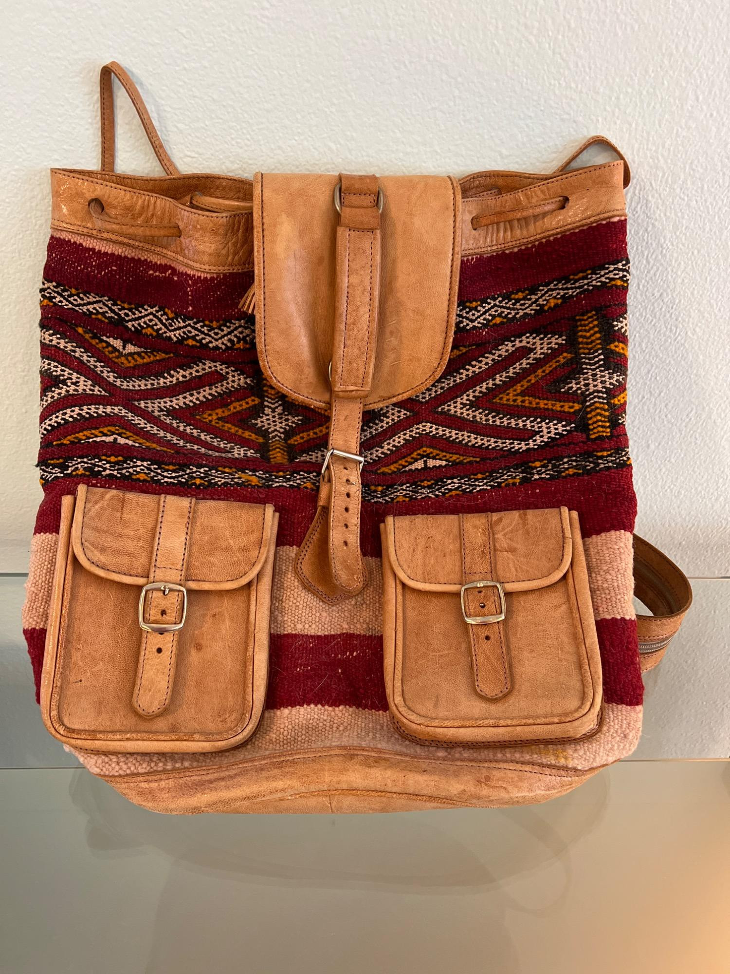 Exquisite backpack/tote made of moroccan leather and handwoven kilim. Leather strapping.