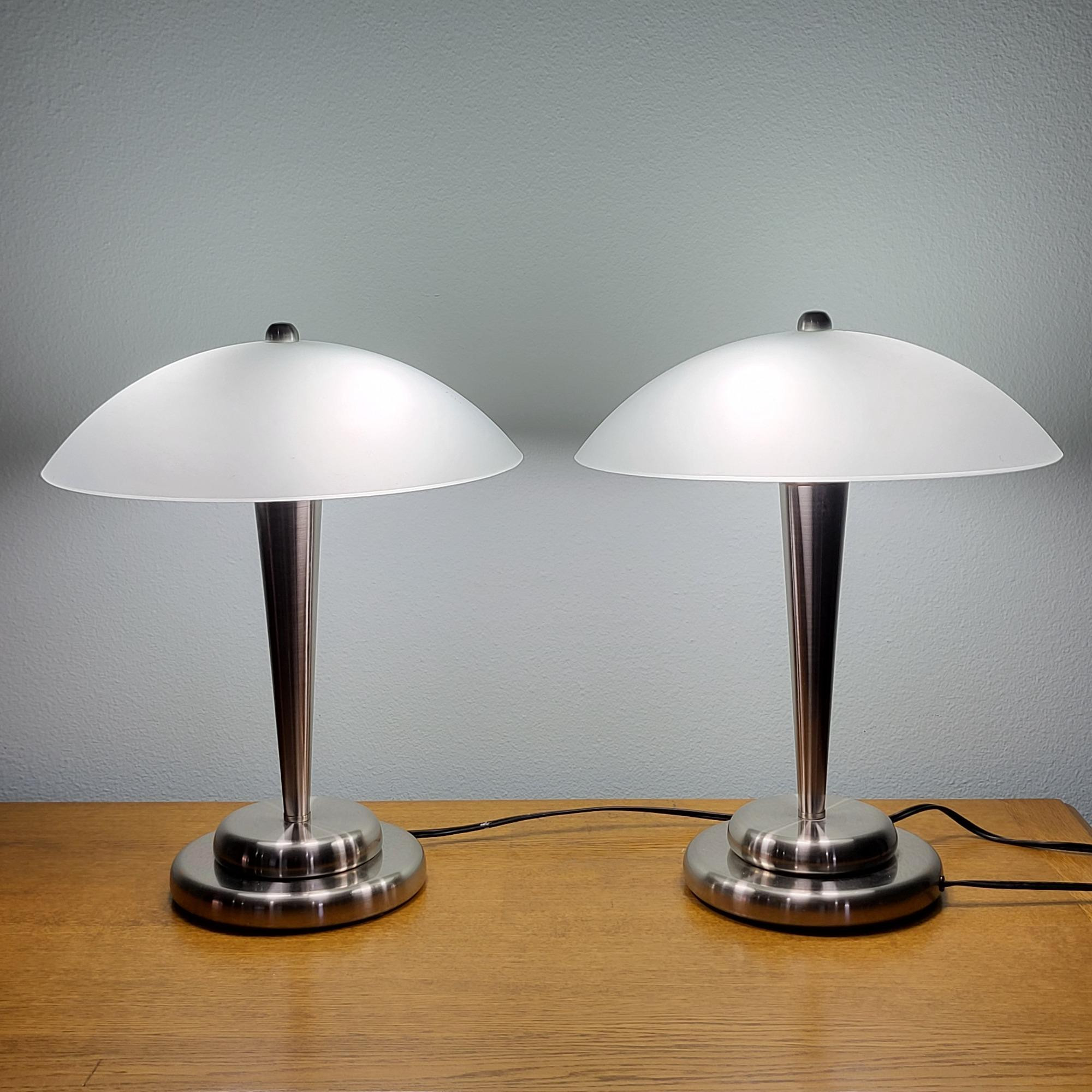 Deco-looking yet modern pair of touch desk lamps. Base of lamps are 8" round. Curved, frosted glass shades are 14" round x 5" tall.