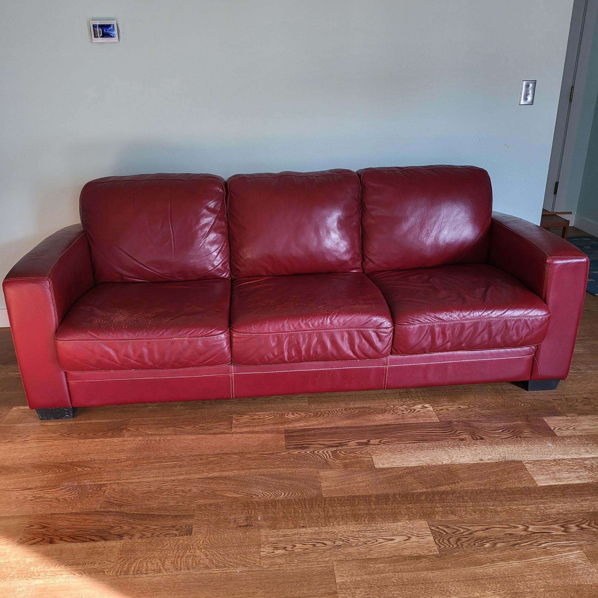 2013 red leather three seat couch. Seat depth is 21" x 16" tall. Leather is worn in areas and cracking. Frame in great shape. Bidding on this lot is an agreement that: (1.) You will have 2 capable, able-bodied persons to lift and load at a minimum. (2.) You