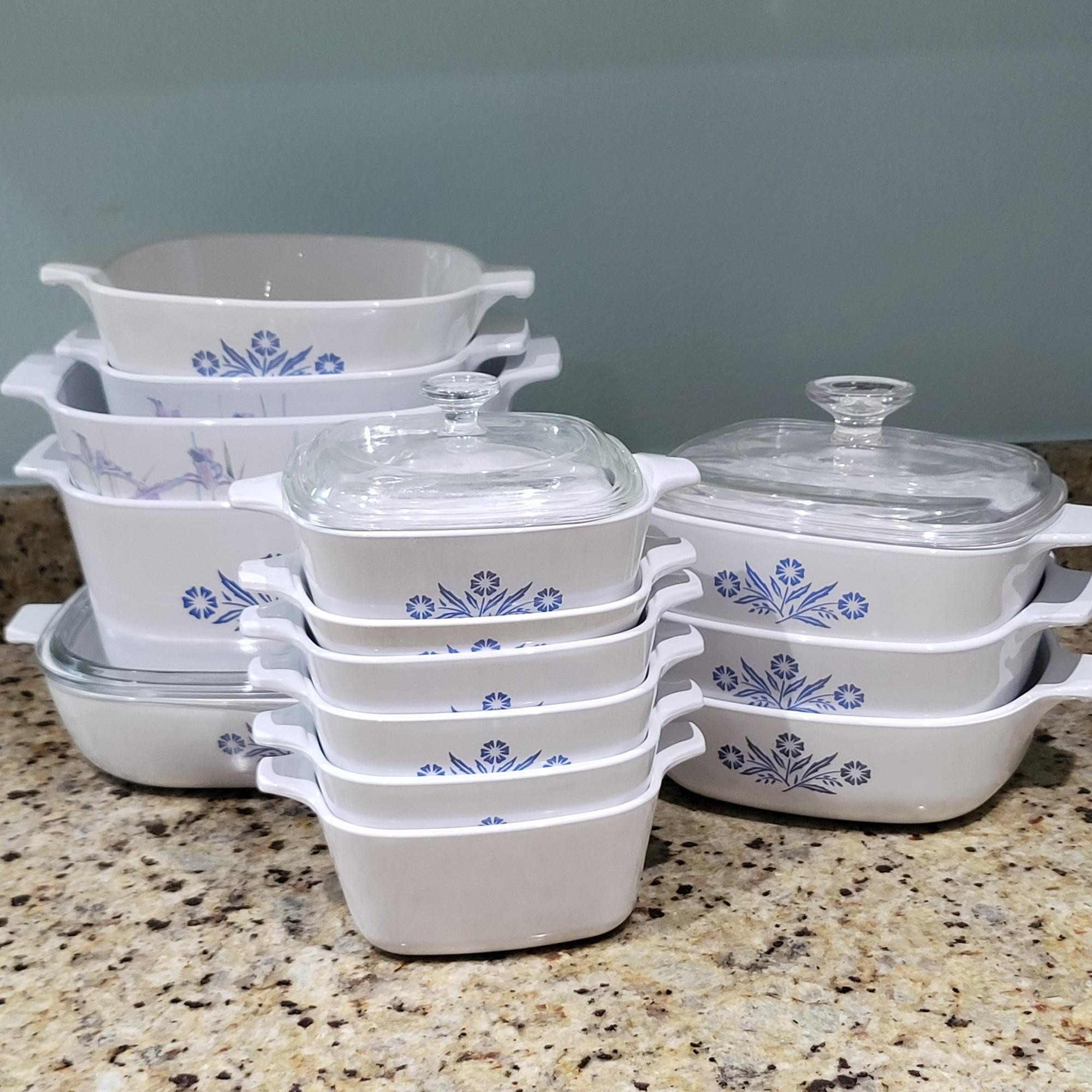 Corning bakeware: Cornflower blue floral baking pans: (1) 10" lidded baker, (1) 8.5" lidded baker, (4) 7" bakers with one lid, (6) 5" bakers with two lids