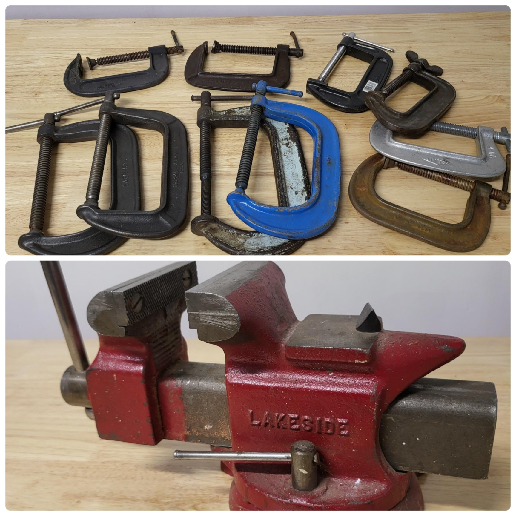Lakeside 3.5" bench vise with 3-hole base to secure to surface. Mostly vintage heavy duty 4" and 6" adjustable C clamps, lot of 10. Chicago brand, Littco, Brink & Cotton and more.