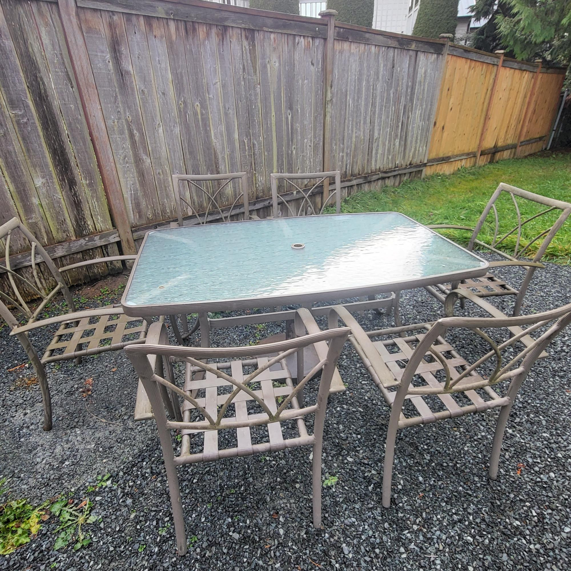 Powder coated steel frame, tempered and textured glass top, umbrella hole. Includes six chairs NO cushions. Each chair supports one person up to 250-pounds. Chairs Dimensions: 26 L x 24 W x 34 H. Also includes umbrella (faded on top, tear in upper part/center but unnoticeable when opened). Mounted on umbrella pole that has hand cranked open/close mechanism that inserts into supportive base. Umbrella expanse is 10 feet and is 8 feet tall from table top.