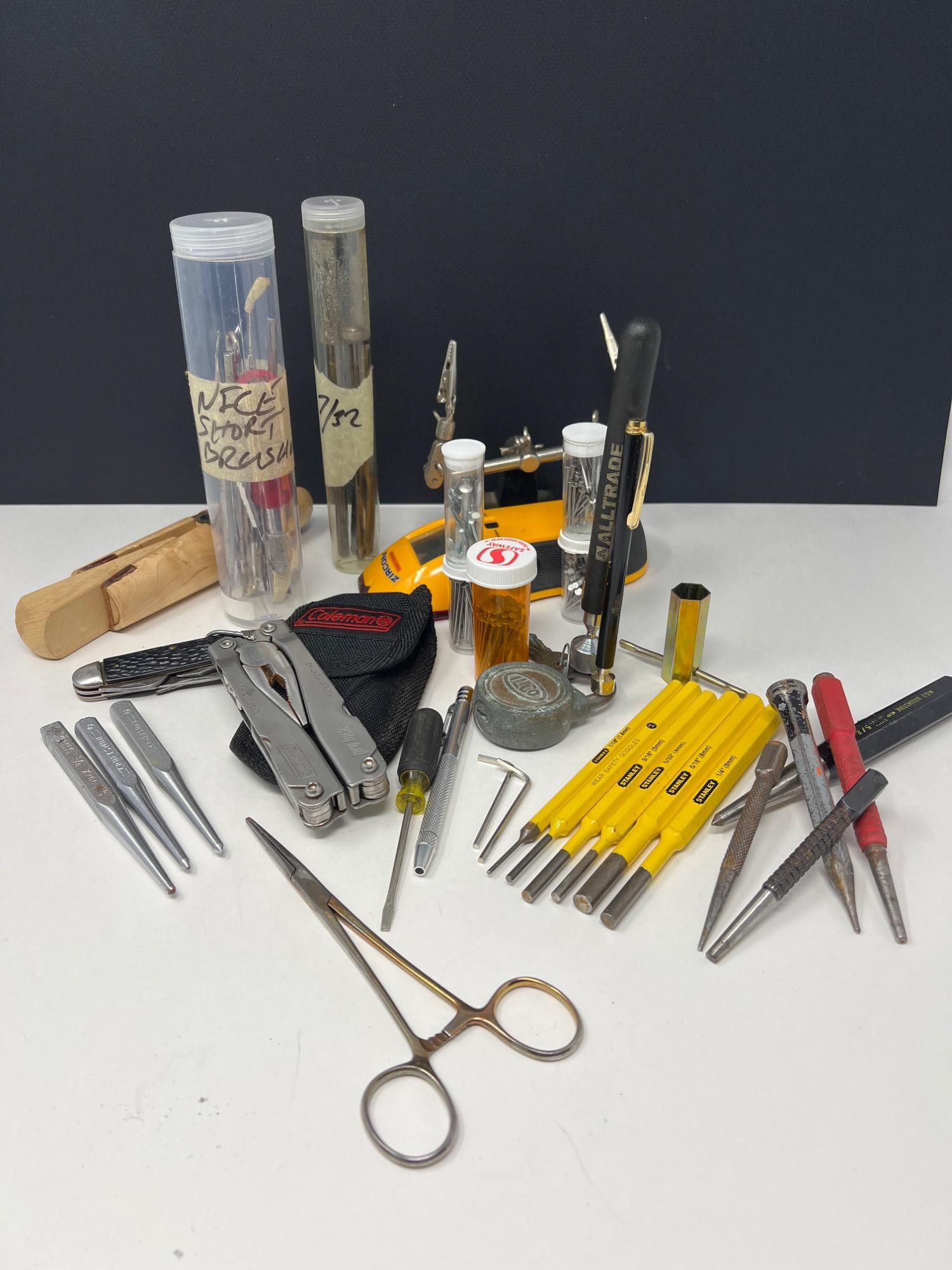 Pin punches, Coleman folding utility knife & pliers, jack knife, old ILCO lock and keys, telescoping magnetic pickup tools (various sizes), clip vise holder, nails, Xacto knives, and much more.