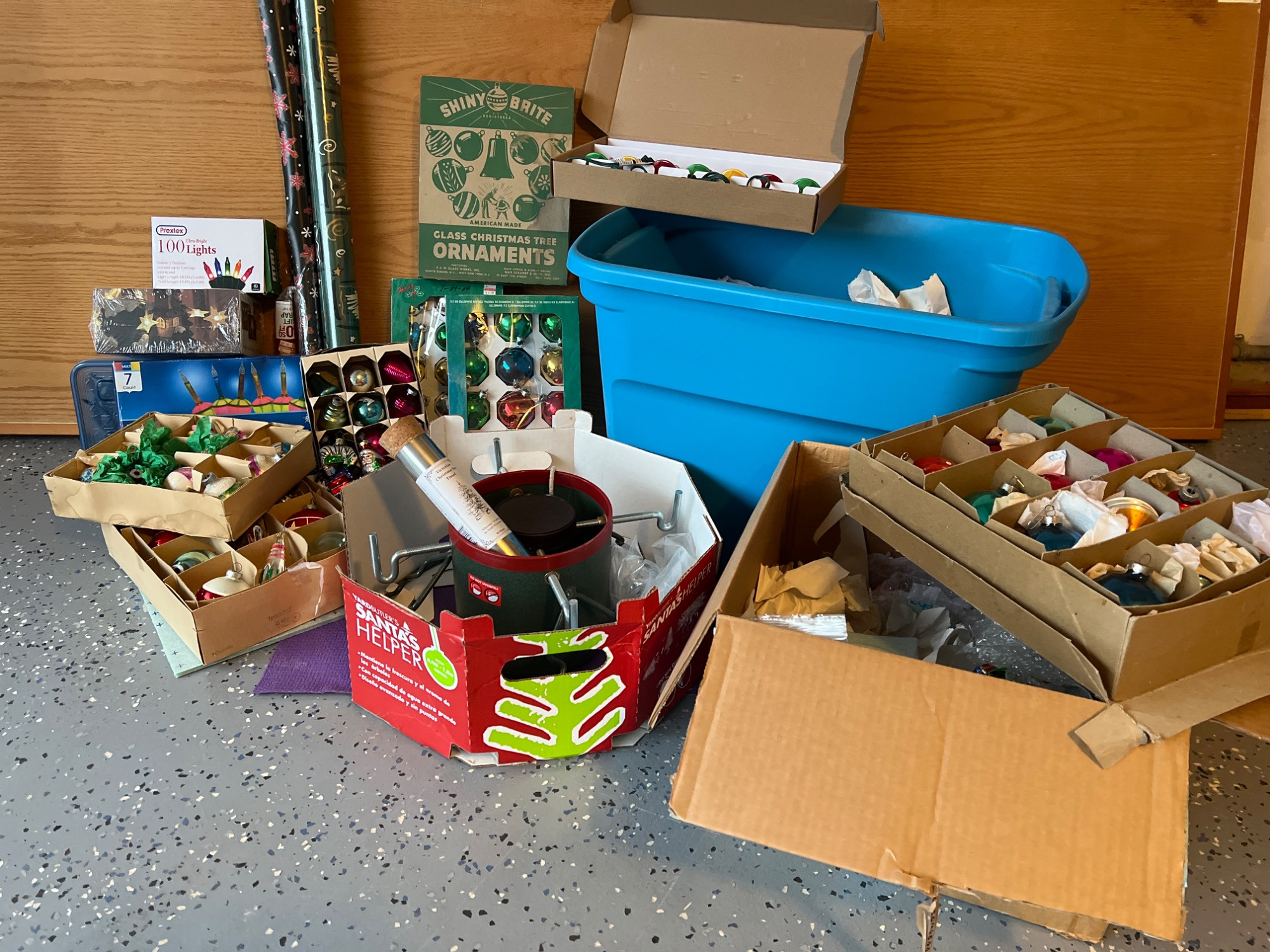 Mid century Christmas decorations including glass tree ornaments, bubble lights, Victorian tree tinsel, more lighting, tree stand, blue bin full of items. Includes the bin.