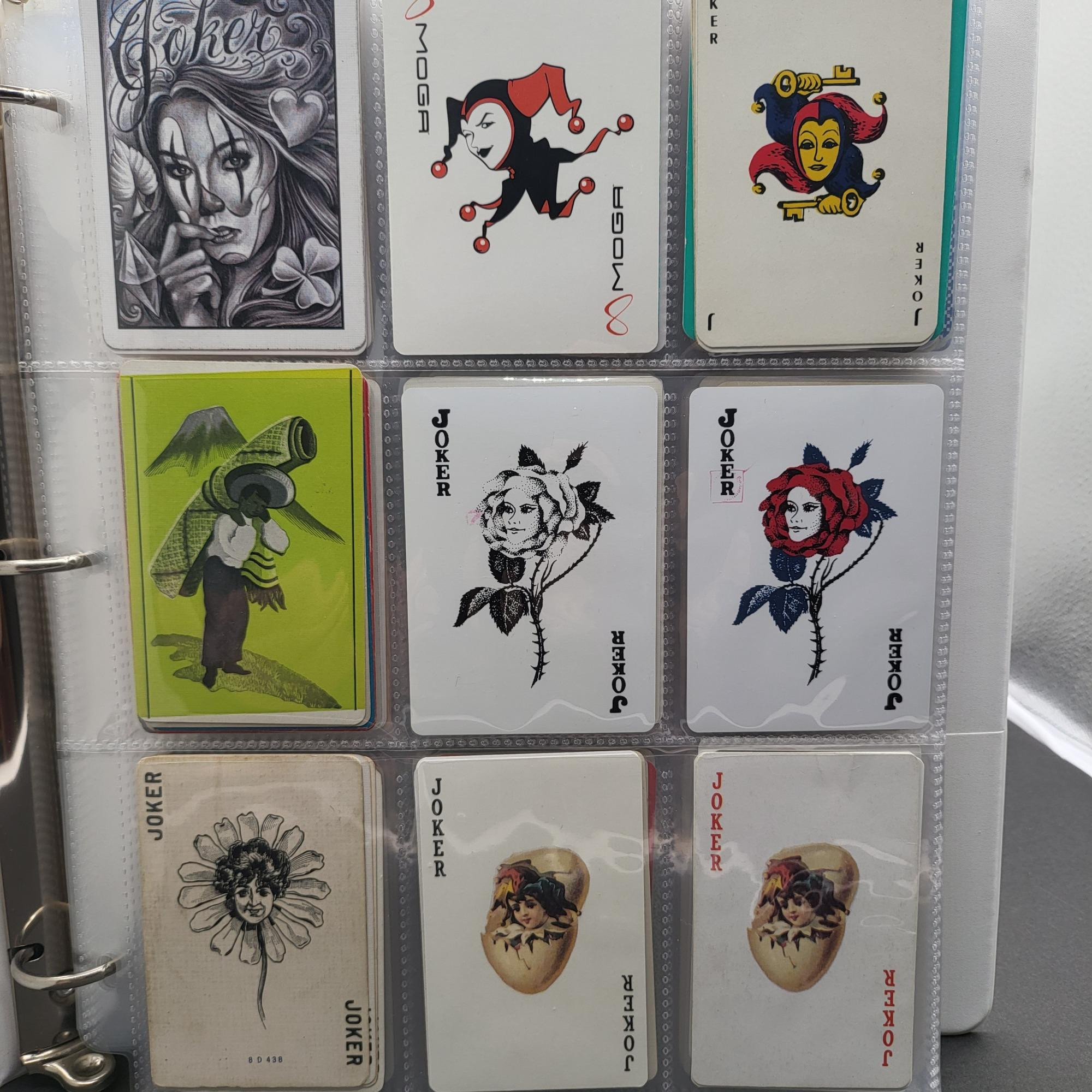 Four notebook binders, hundreds of Joker playing or trading cards. Many vintage art variations and advertising.