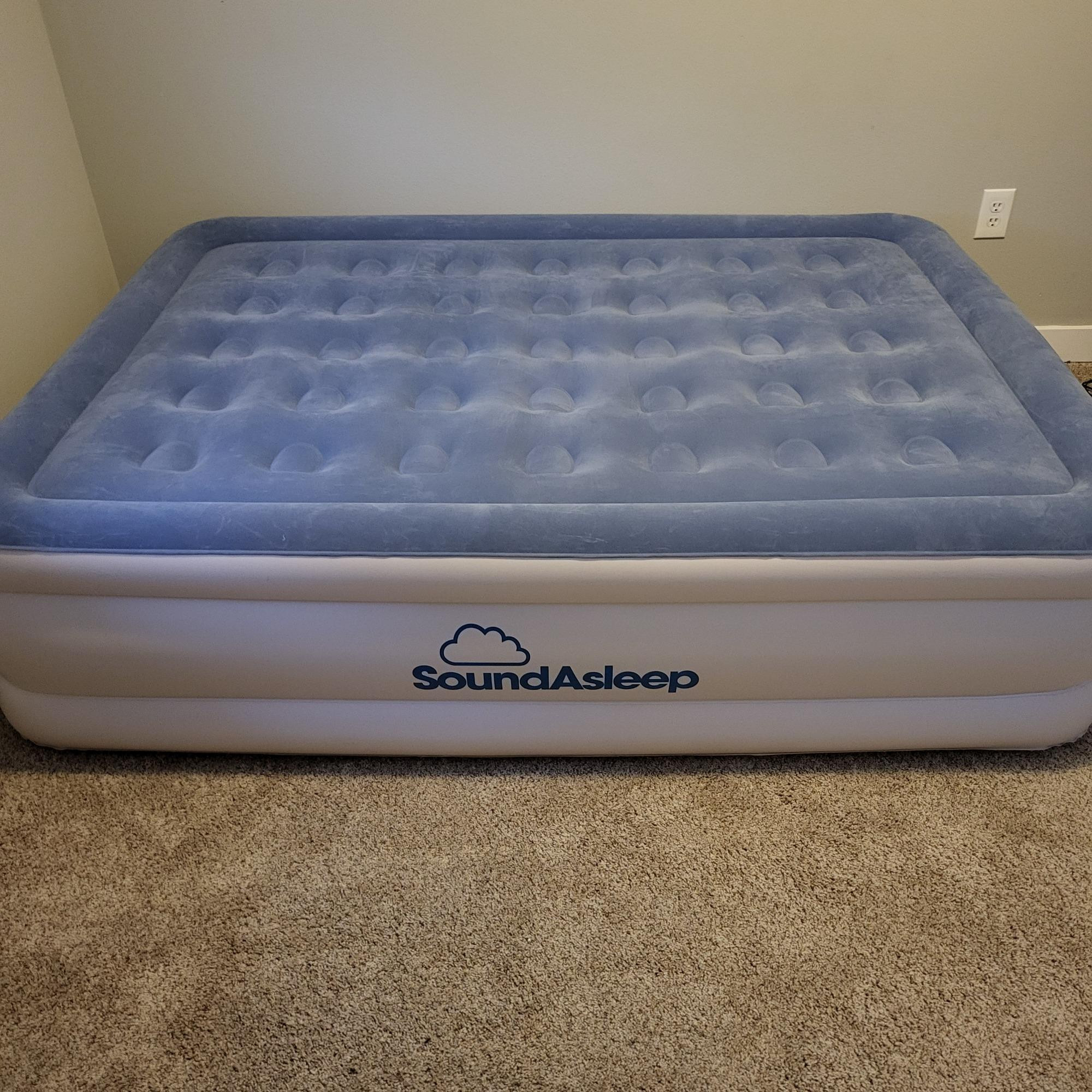 SoundAsleep electric inflatable air mattress, full size. Water redistant flocked top. Internal inflate pump. EXTRA THICK, WATERPROOF FLOCKED TOP ensures a comfortable sleeping experience while multilayer, puncture-resistant Eco-Friendly PVC makes this mattress extra durable and long-lasting. DAILY USE WARNING: The SoundAsleep air mattress is not designed to be used every day. It is not meant to replace a traditional bed that you would purchase at a store. Our air mattresses, and really all air mattresses regardless of brand, are meant as temporary beds, or for sporadic use. If you use it every day, the mattress will degrade and not last as long as a traditional bed. STRETCHING: Stretching is a natural characteristic of new vinyl air mattresses and the first few times you use the mattress. Some stretching will occur suggesting that the mattress is losing air. However, it is simply stretching under your body weight and this is normal for the first few uses. Just give it a top up with a little more air as needed!