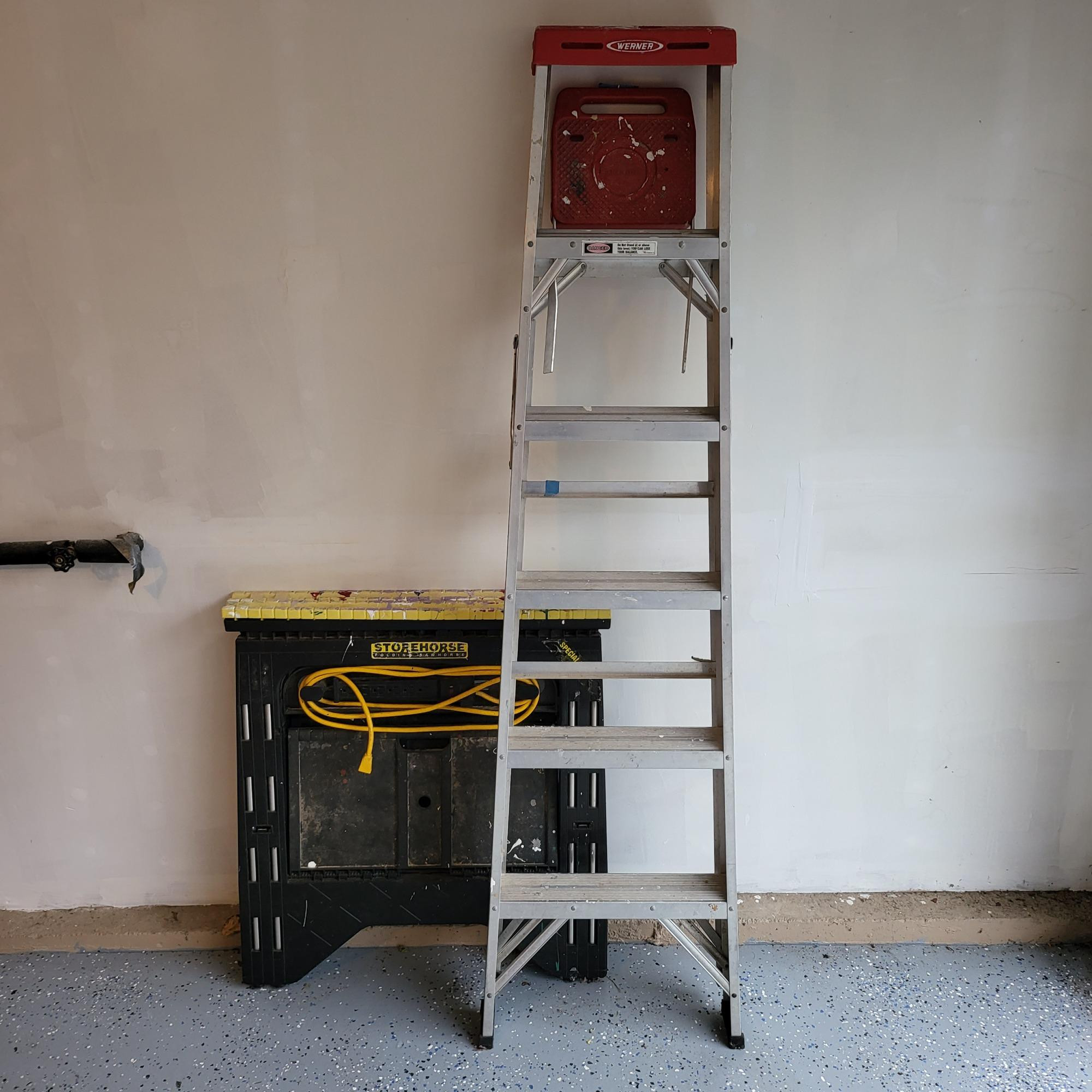 Werner 6' aluminum ladder and a pair of plastic Storehorse sawhorses. One sawhorse has electrical cord with built-in outlet.