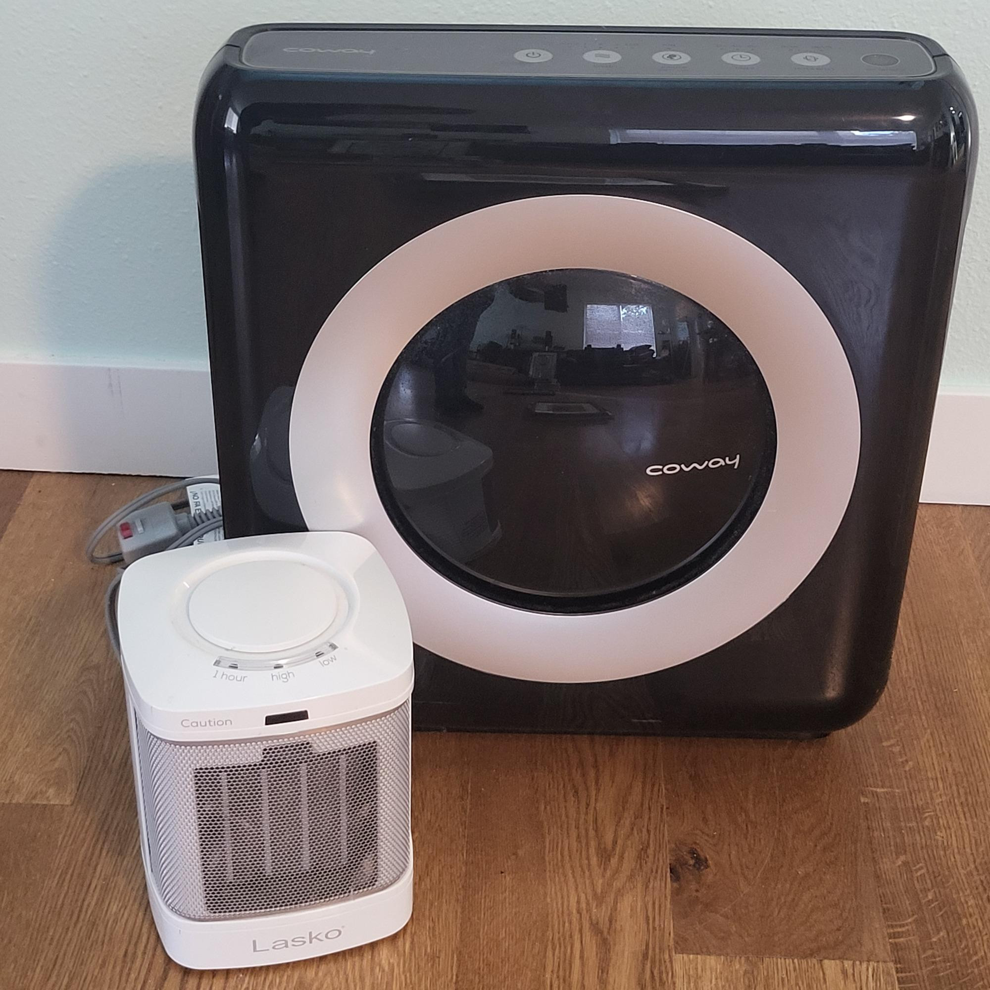Black Coway AP-1512HH Ionizer Air Purifier and Lasko CD08200 portable heater. Both work.