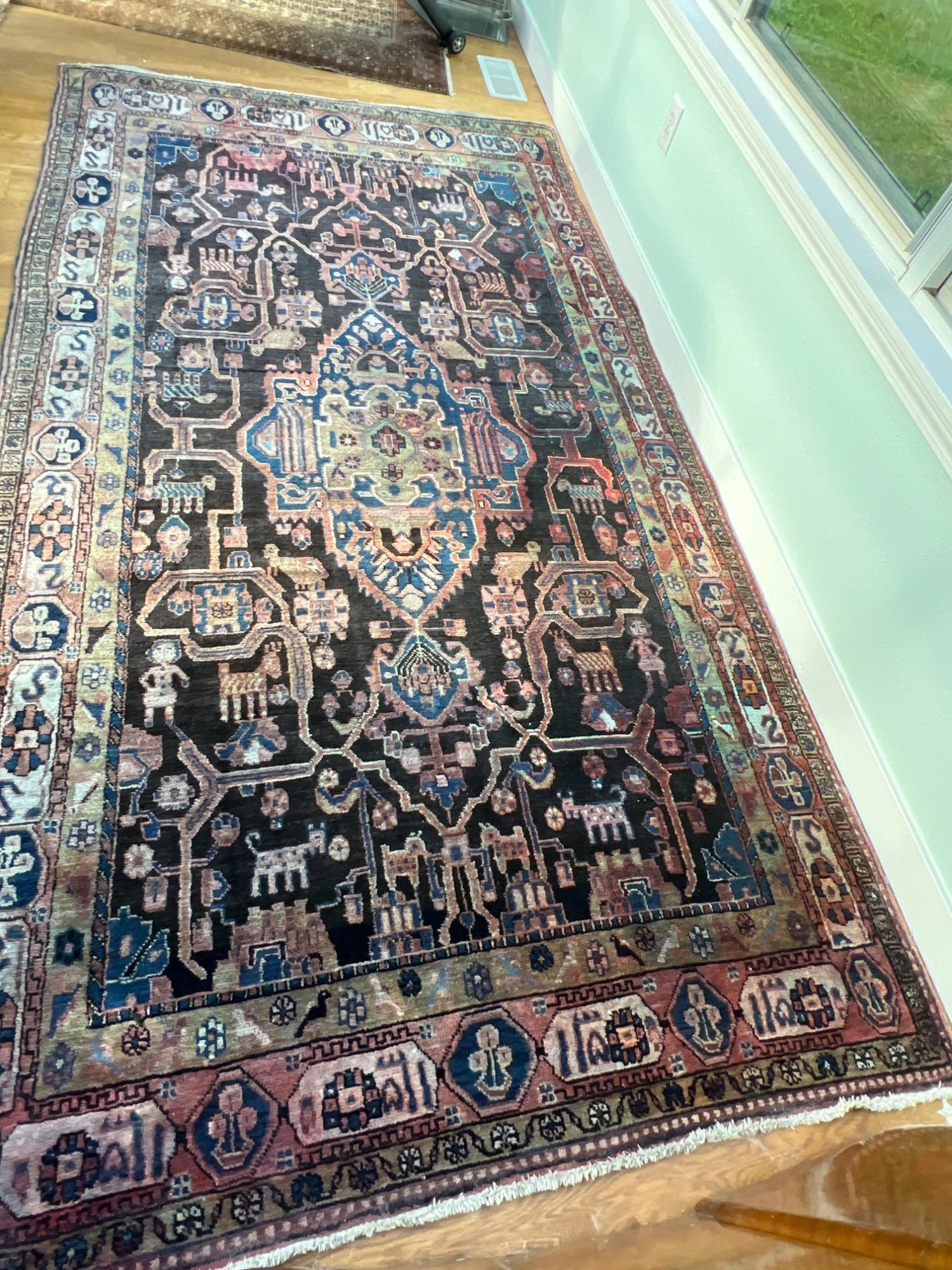 Large 9.5 feet x 5 feet area rug sold by Ecarpetgallery. Origin is Turkey. Hand knotted. Color transitions with integrated villager design. A cloth backing has been sewn onto underside.