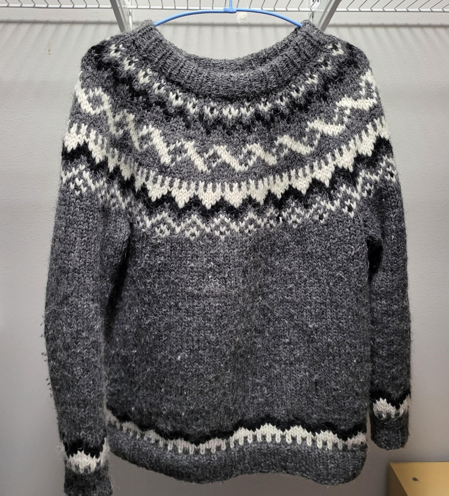 Pure New Wool sweater, The Handknitting Association of Iceland, size L. Grey with white & black geometric pattern. Icelandic wool rarely needs washing and can easily be freshened up by letting it hang outside in the fresh air, but if you still wish to wash it, do so by hand and with lukewarm water and special wool soap. Let it soak in the water for 10-15 minutes, and then rinse it with clean water (DO NOT rub it or wring it, INSTEAD gently squeeze it to get as much water out as possible). To dry your piece, do not hang it as the weight of the water could stretch the wool, and instead, lay it flat on a towel. Do not use a dryer machine as the garment will shrink.