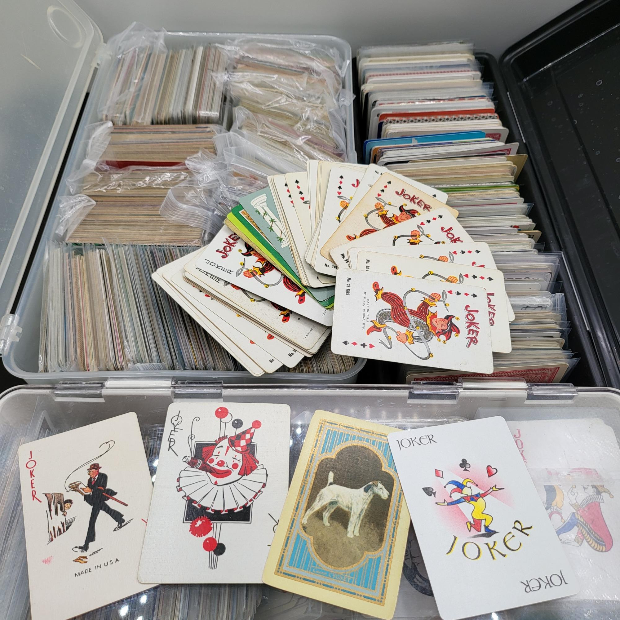 Three storage containers if Jokers, Aces and other playing cards. Hundreds of different vintage art, brands, and variations.