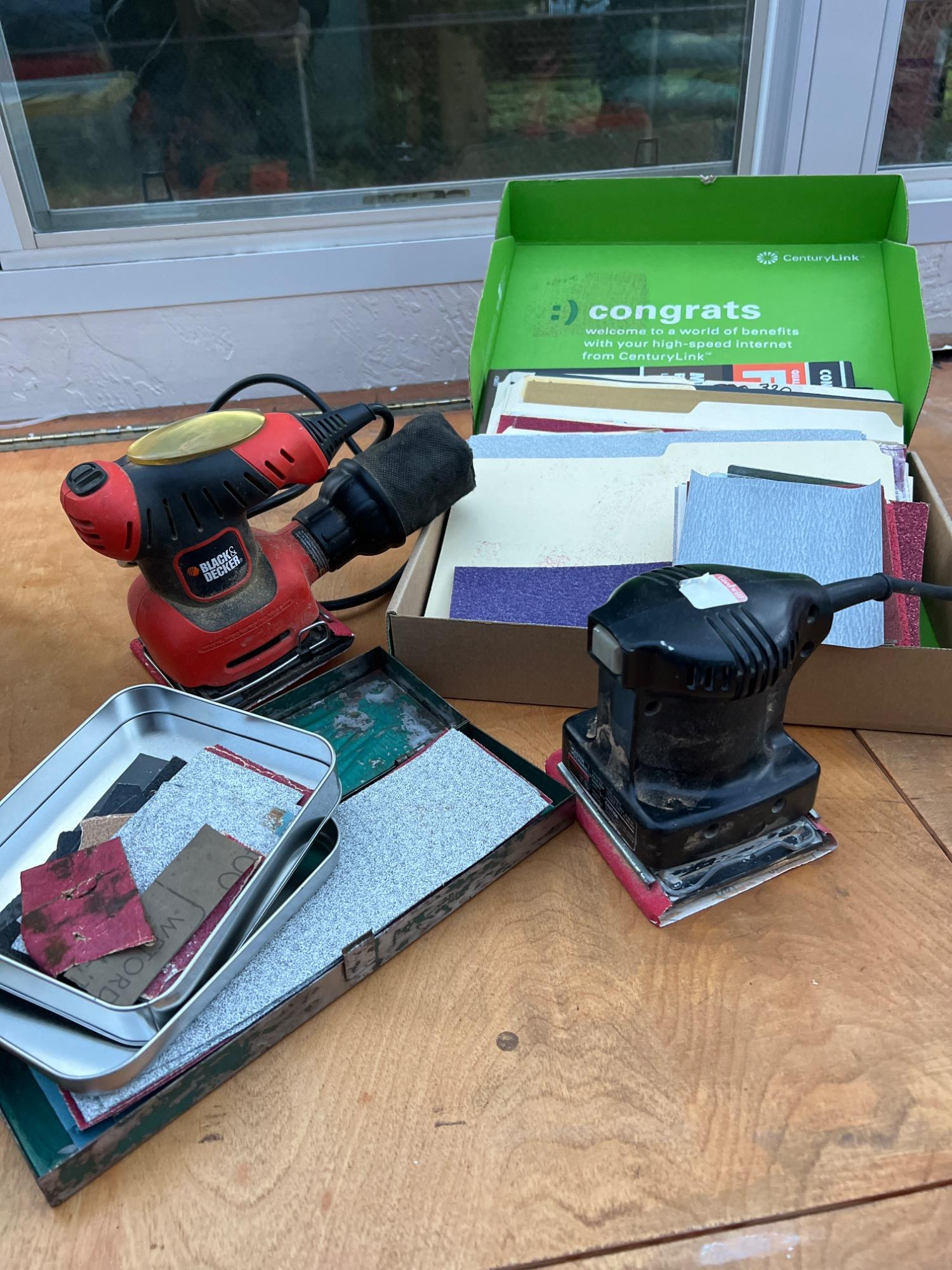 Two hand held sanders with box of various weight sand paper and sandpaper squares.