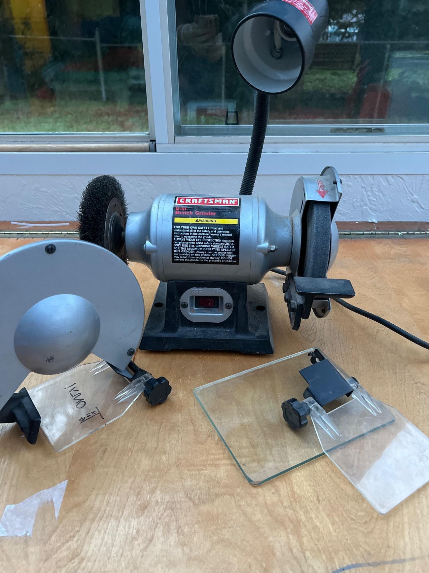 Powers on. Two safety guards and shields. Extra brush. 6 inch Craftsman. Built-in flexible arm light. 1/6 HP, 2.1 Amp, 3450 RPM, 120 V.