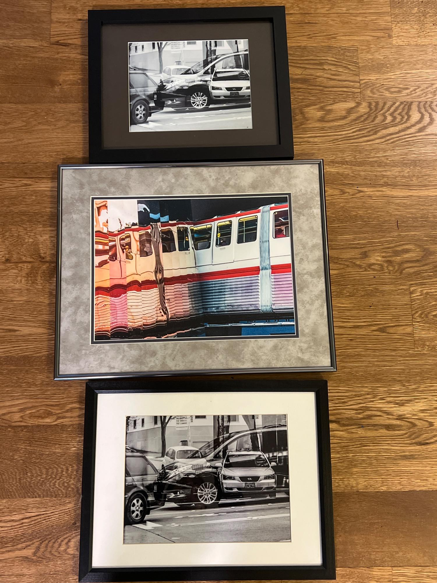 Original photographic images by Jan. Color photo of Subway Train - 20” x 16” Black and white of Vehicles - 15.5” x 13” (black mat) Black and white of Vehicles - 17” x 13.25” (white mat)