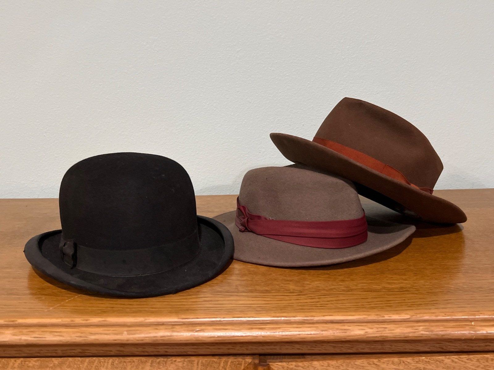 Three wool hats: antique black Schoble Men's Derby Hat; vintage Brent wool Fedora; vintage WPL/USA 100% Wool Fedora.