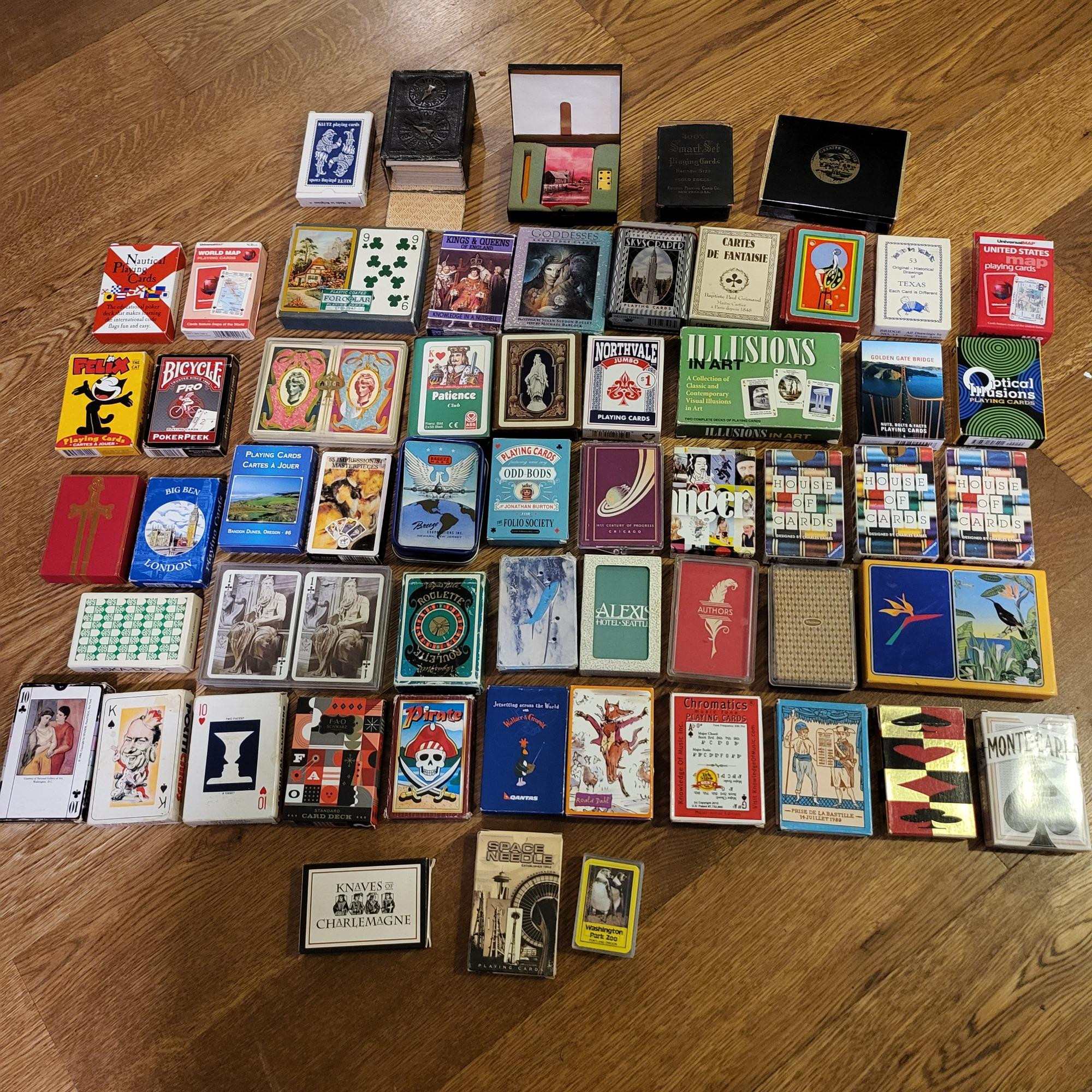 Decks of playing cards, mostly opened but complete. Over 50 decks.
