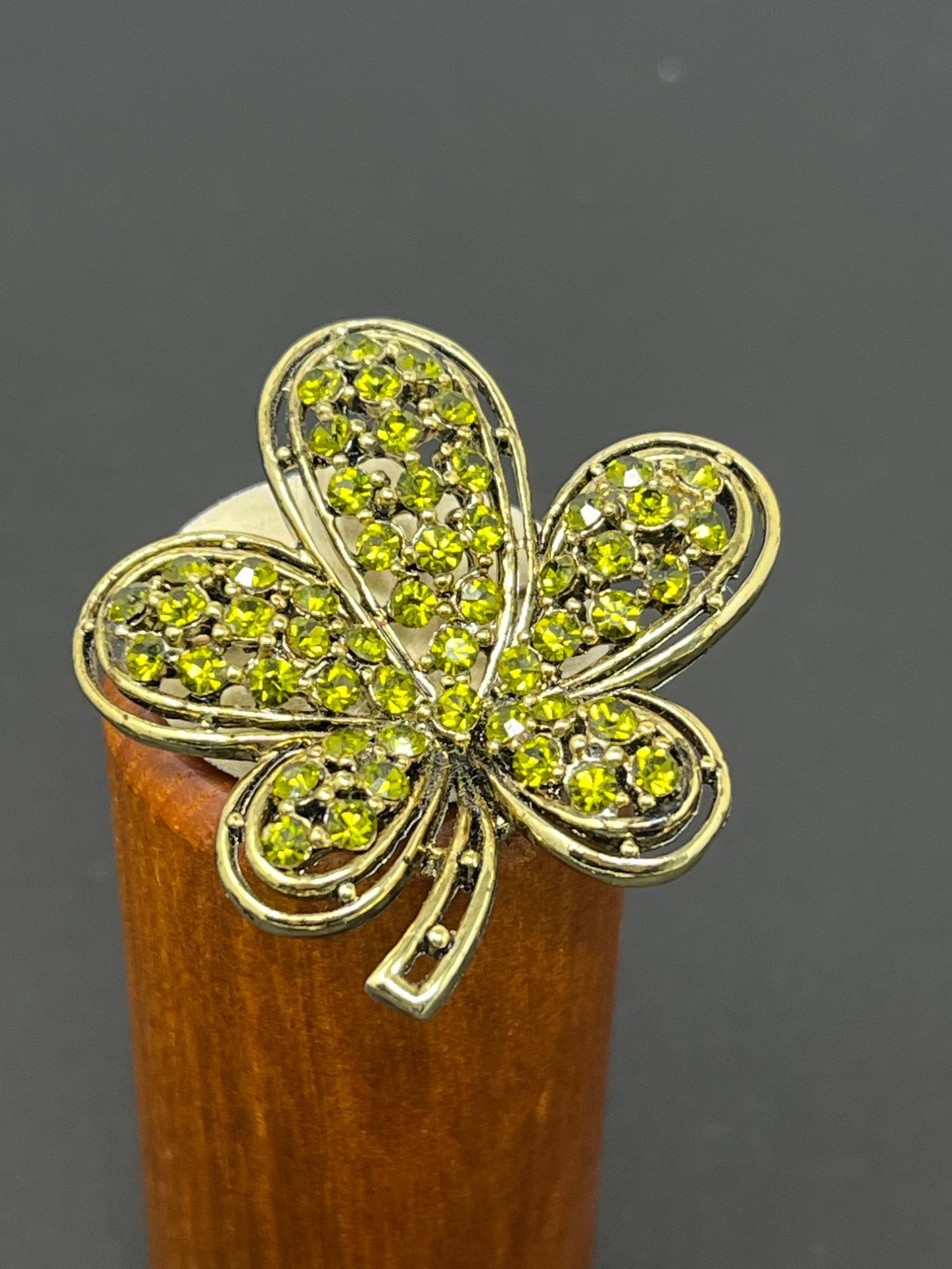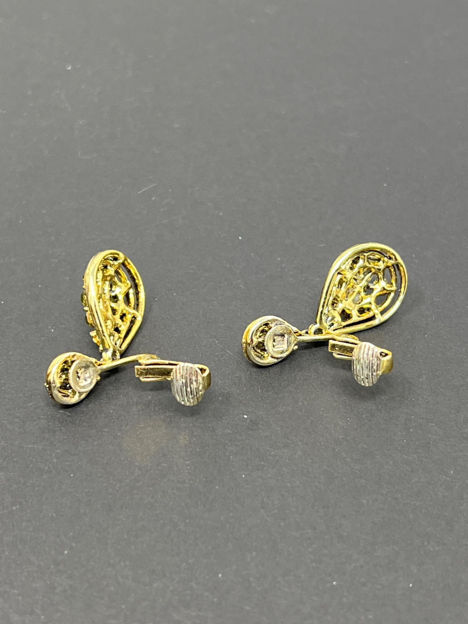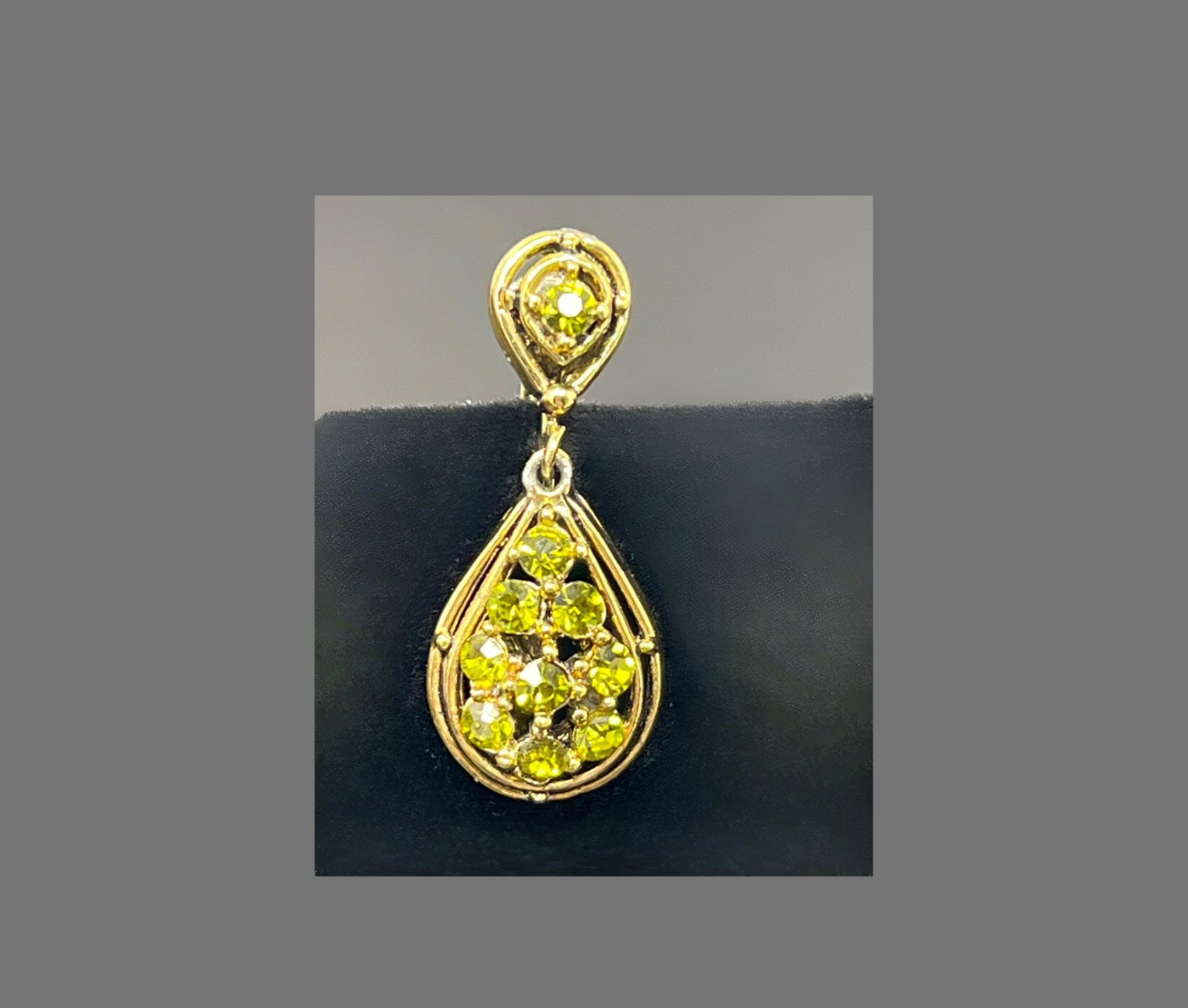 Beautiful vintage lime green rhinestone set. A five petal flower brooch set in gold tone setting and matching clip on earrings with tear drop styling. These stones have exquisite sparkle.