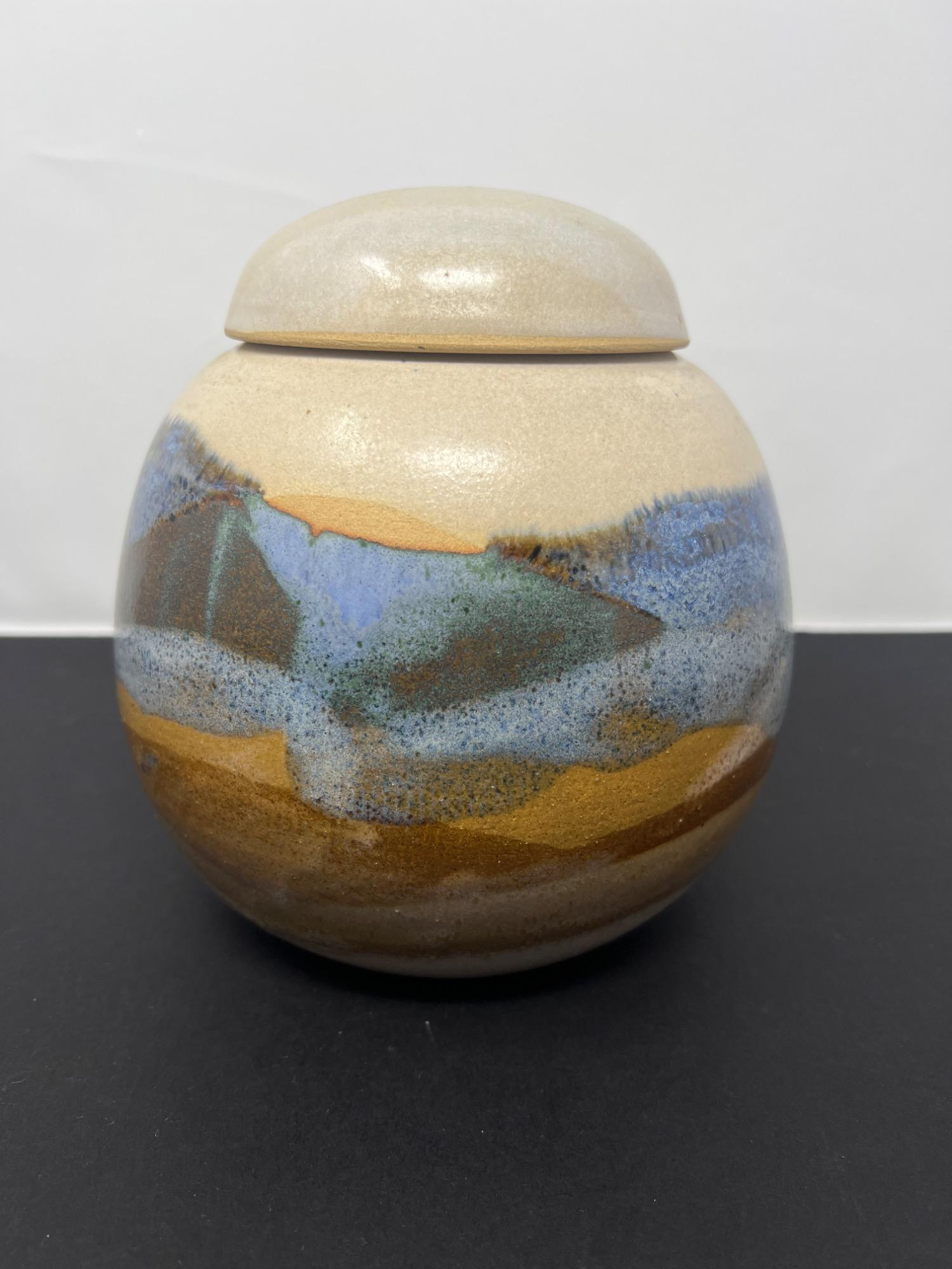 Oustanding studio art pottery signed by artisan. Lidded and colored depicting mountain, hillside, and land. Smooth finish. GT