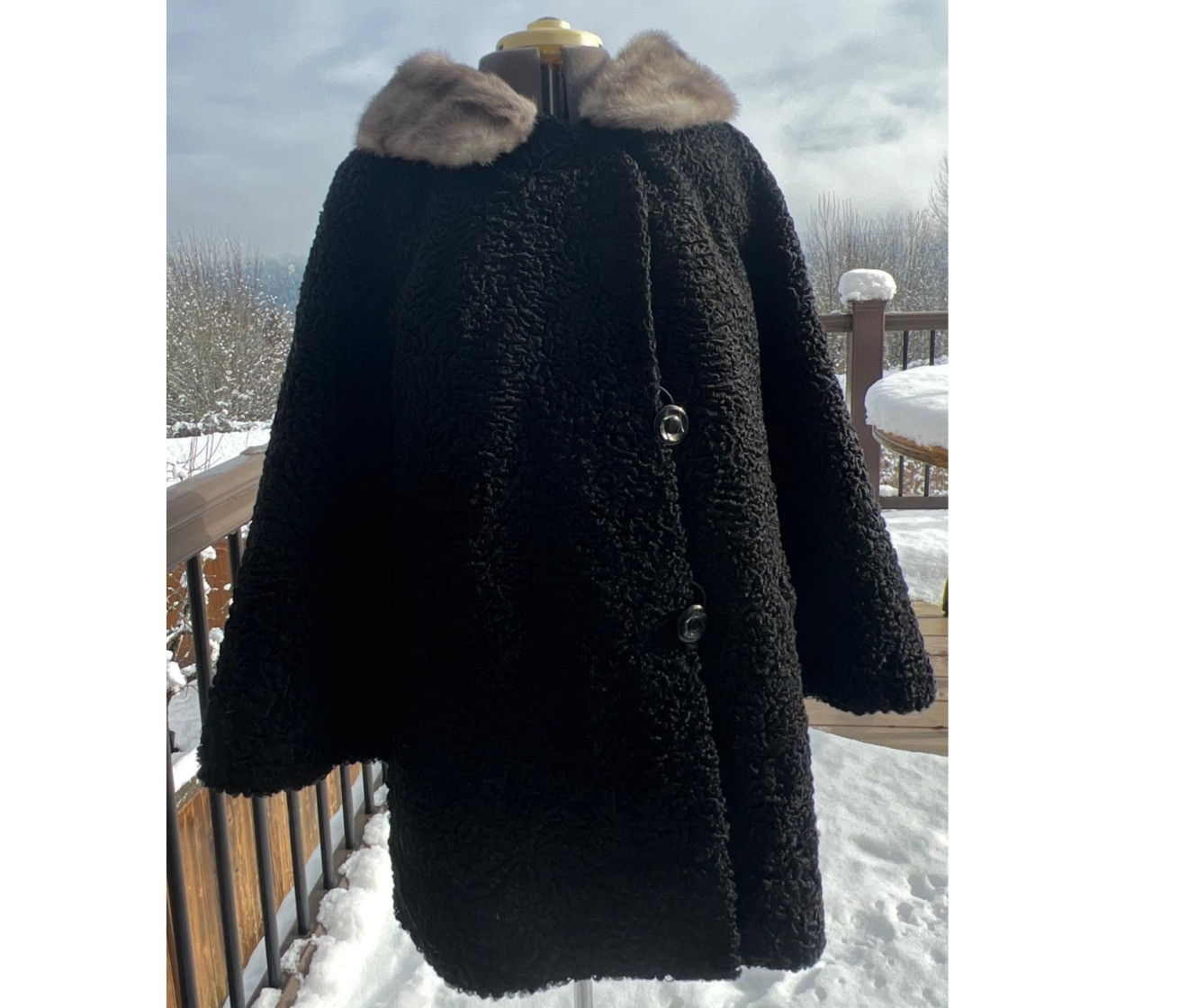 Originally purchased from The Weston Fur Company in British Columbia, Canada, in 1965. Black dyed Persian lamb 3/4 length coat with fur collar. Includes outside pockets and hidden inner pocket. Fully lined. Two large button enclosures with hooked closure at collar. Cost of coat was $350 in 1965 which would be approximately $3,300 today. Stored in wardrobe bag and in like new condition. Sleeve length 23”