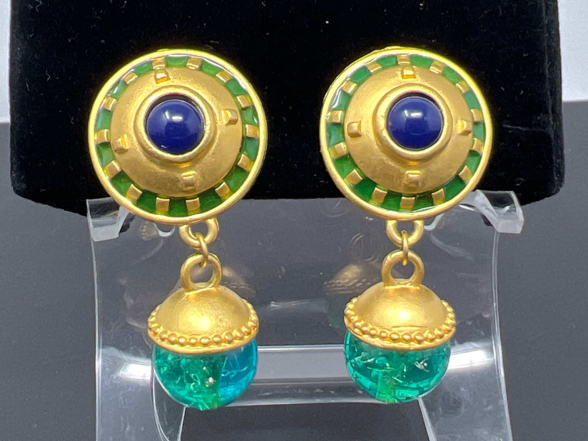 Vintage Leslie Block oversized acorn earrings. Chunky satin gold Etruscan style with Lapis lazuli inserts. Clip on.