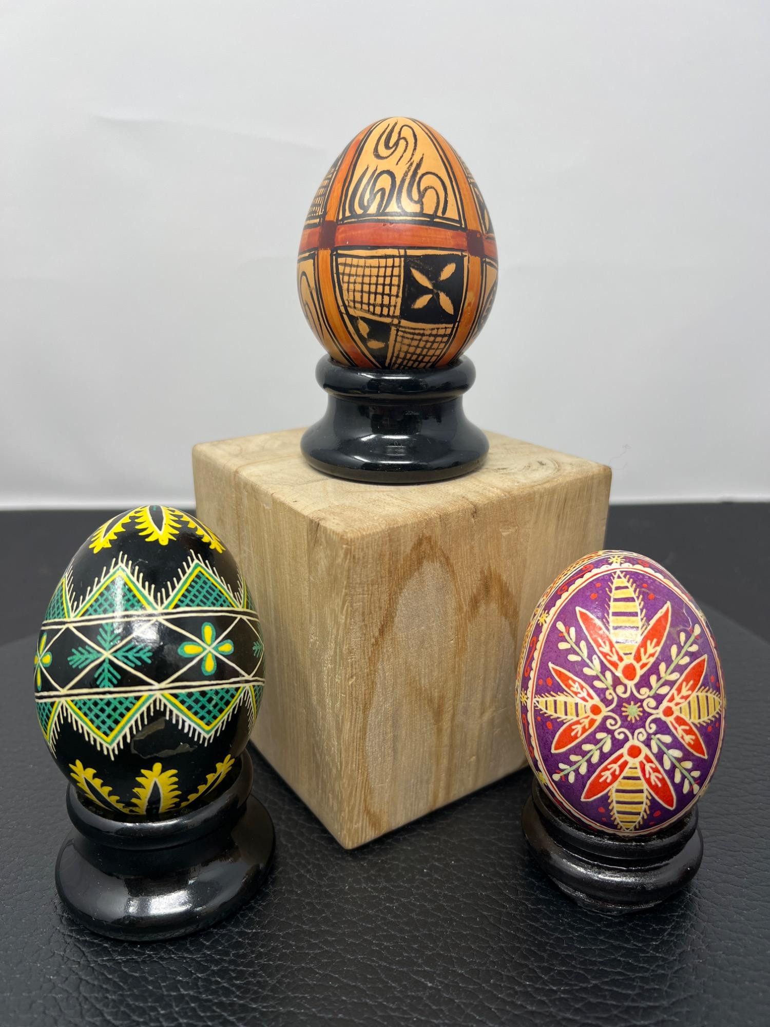 Two lighter painted eggs with a clear finish. Appears to be egg shell.