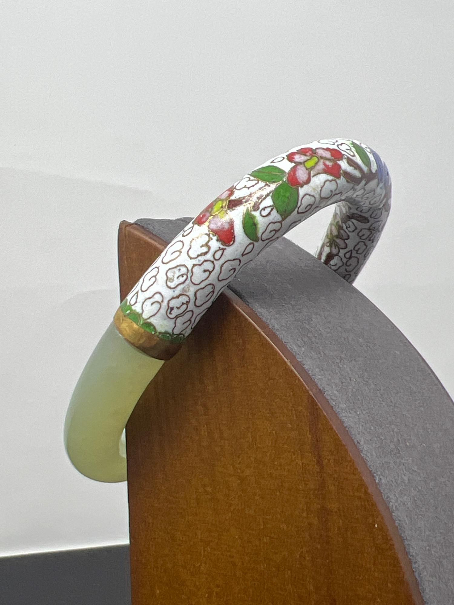 This vintage Chinese jade and cloisonné bangle bracelet is made with high-quality jade of a beautiful green color. It is complemented by intricate cloisonné detailing, creating a harmonious design of half jade and half cloisonné. The bracelet's design draws inspiration from traditional Chinese artistry, offering a blend of jade's natural beauty and the vibrant enamel work of cloisonné. Made in China, this bracelet adds a touch of elegance to any collection or outfit. With a thickness of 0.45 inches, it is designed to fit comfortably while making a subtle, yet striking statement.