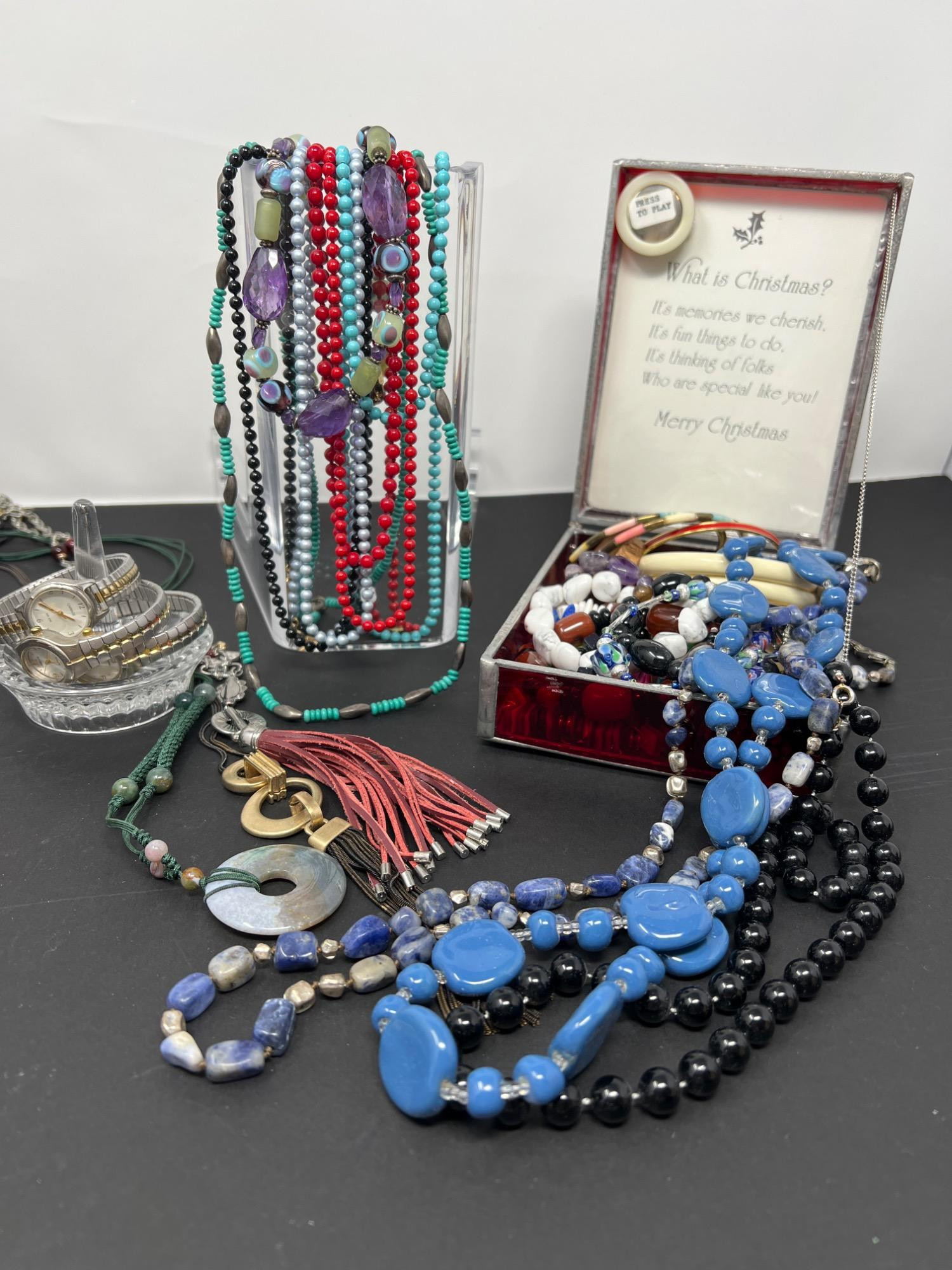 Varied lengths 16” to 30” beaded necklaces Leaded glass trinket box with several beaded bracelets and more Three Carriage ladies’ wrist watches GT