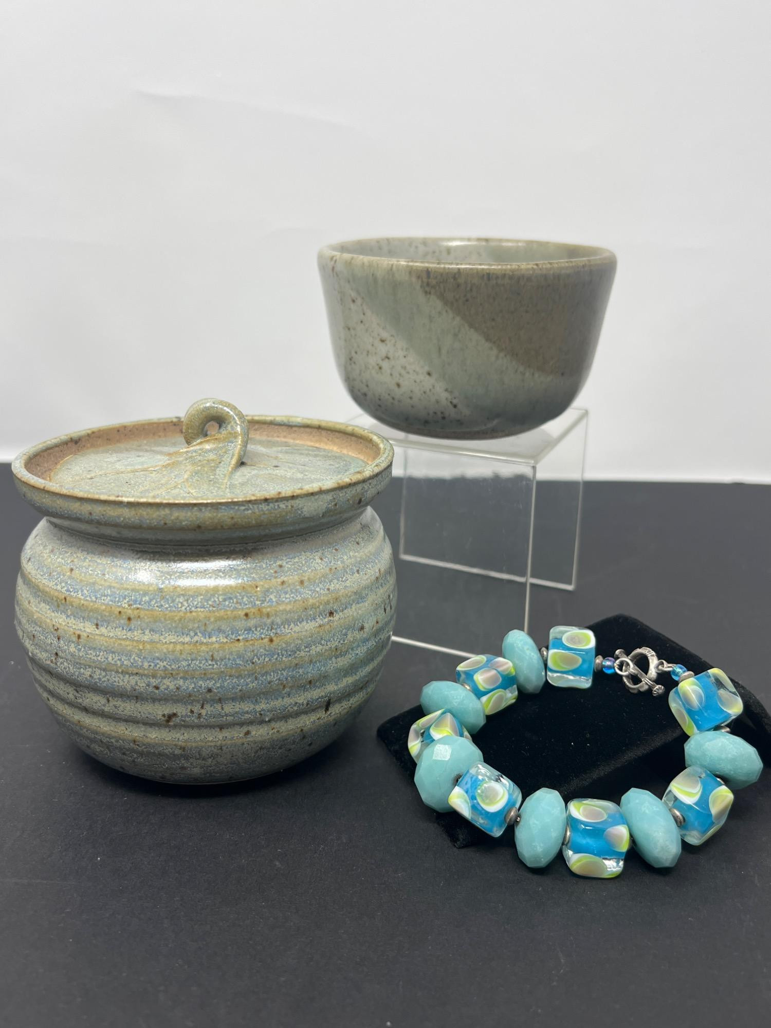 Glass bracelet 7.5” long Signed pottery bowl 2.75” tall x 4” round Signed pottery bowl with lid - 3.5” tall x 4” round GT