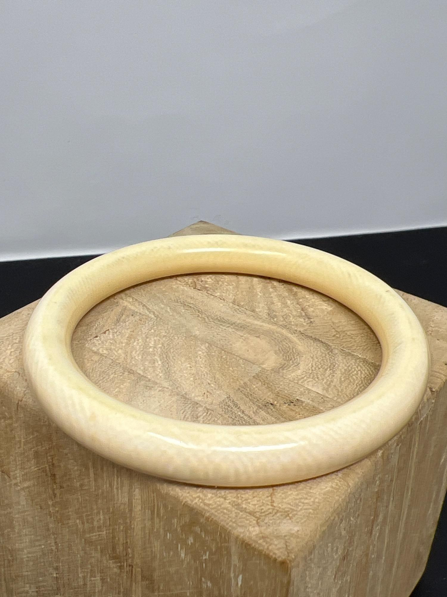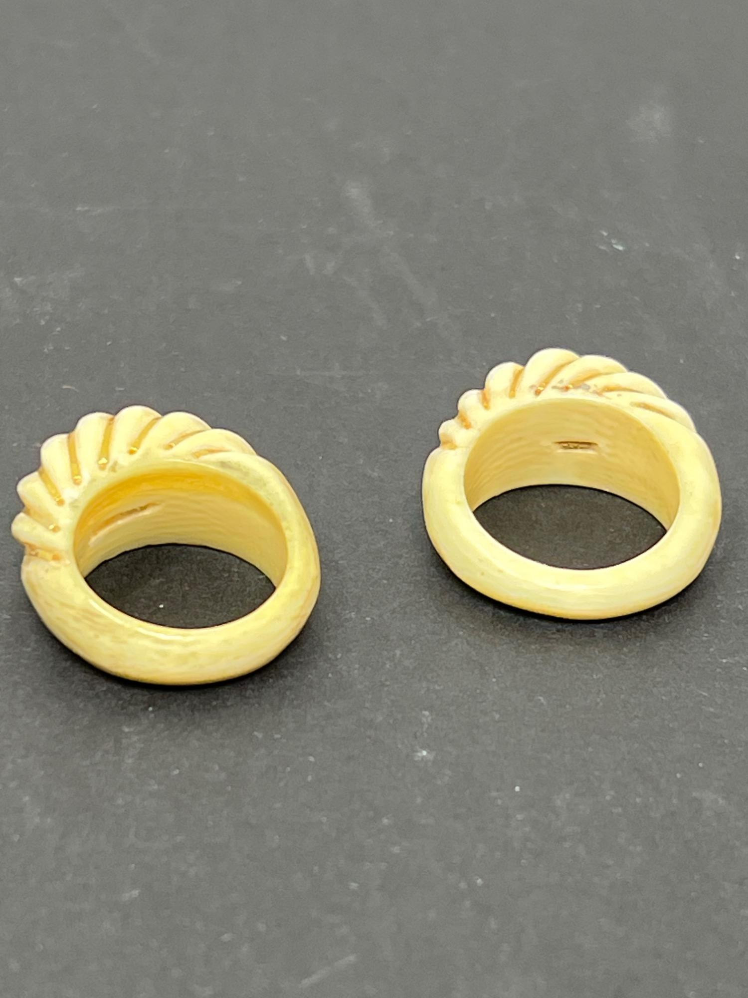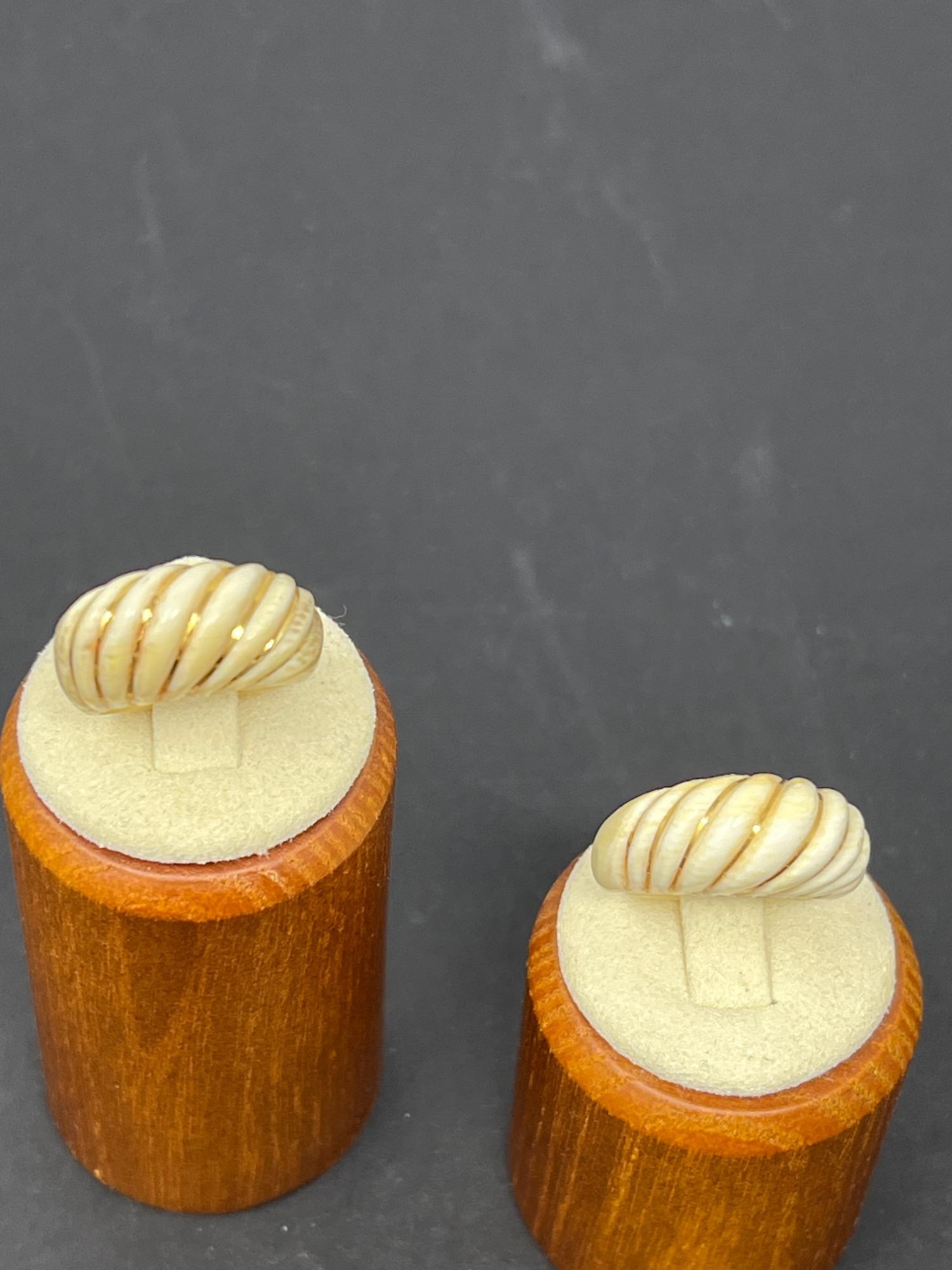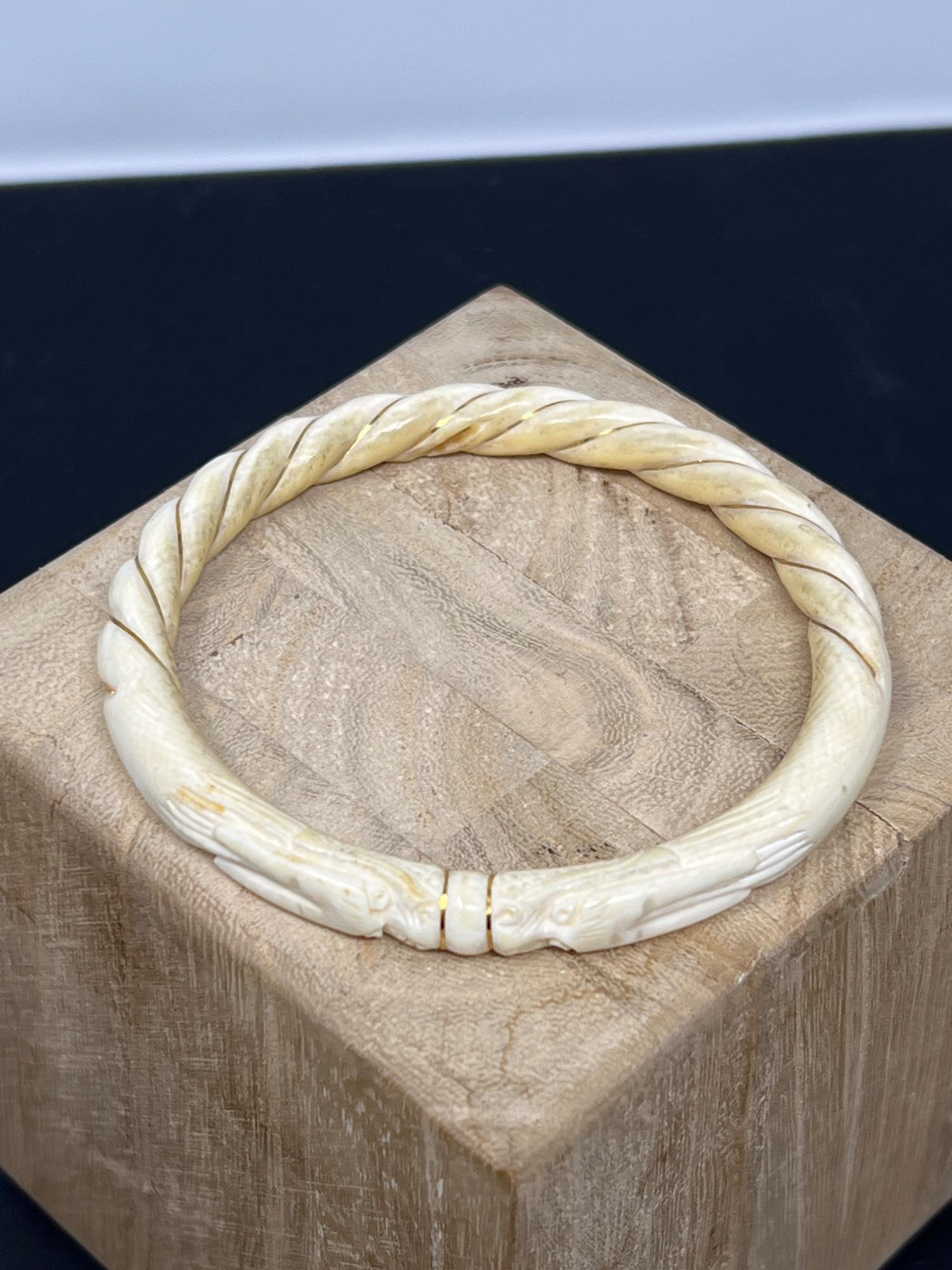 Bracelets are 2.5 - 3 inches round. Bone detailed with 14k gold thread. Rings - size 6-6.5