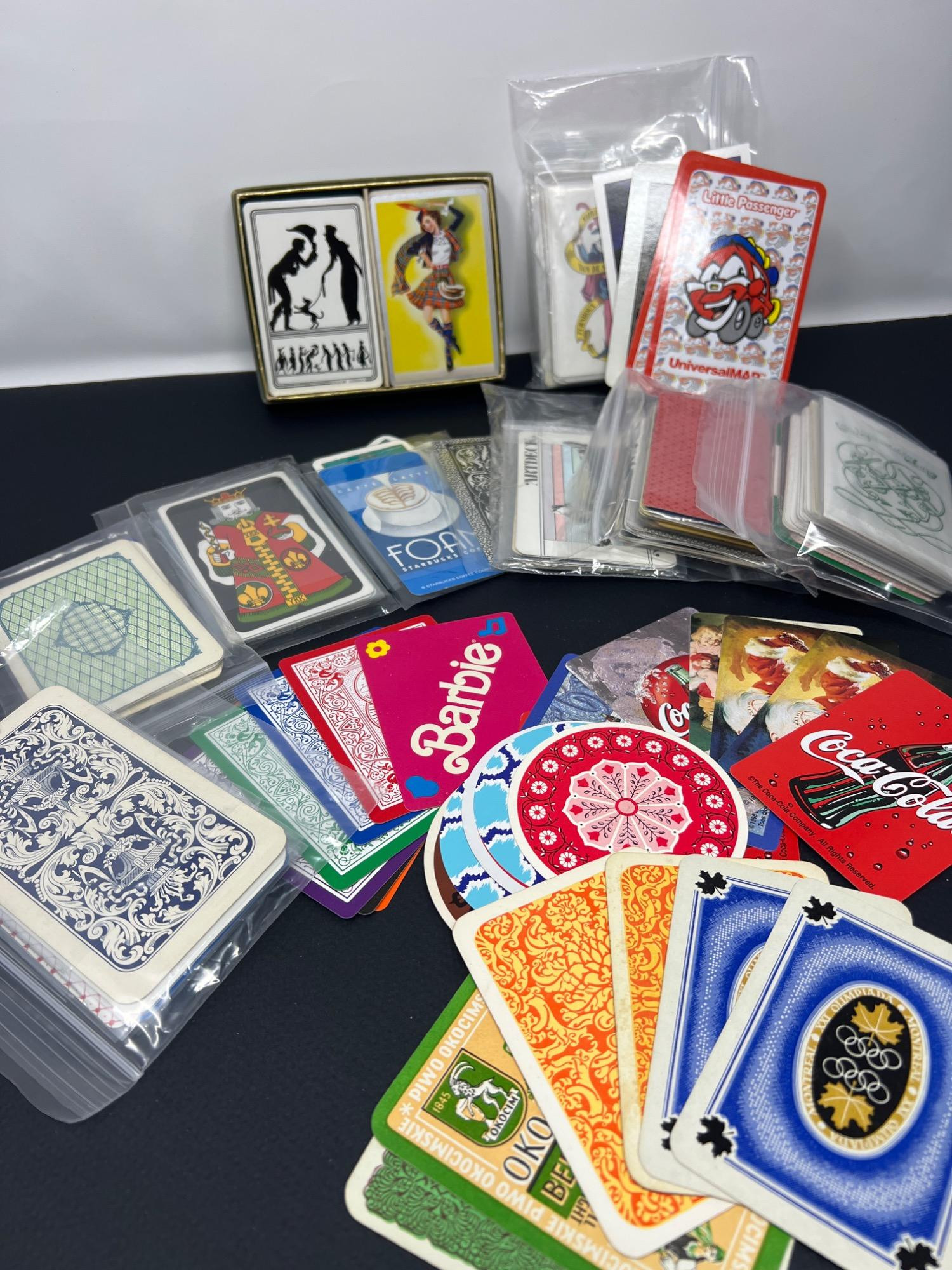 Stacks of collectible joker cards plus kings, aces and others. Coca Cola & Coke Tin, Round playing cards, Disney, Barbie, Art Deco, Route 66, Olympiad, Cracker Jack and many more.