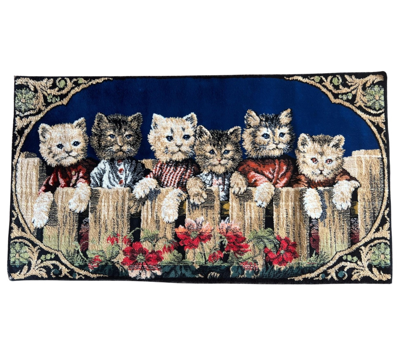 Exquisitely preserved handcrafted chenille tapestry with six dressed cats peeking over wood fence. Backside demonstrates knotting construction. Soft, smooth feel to tapestry. Coloring is crisp. Dated early 1900's.
