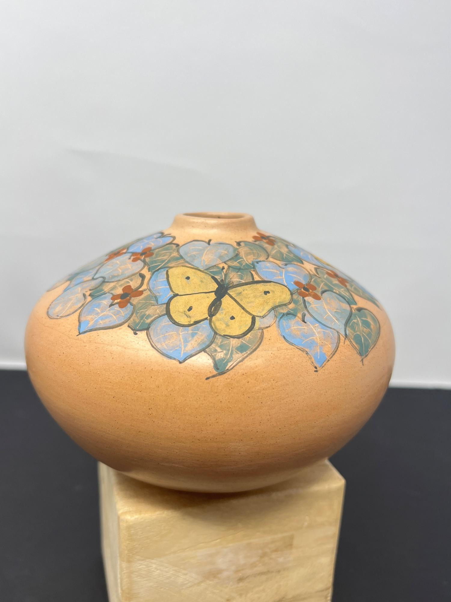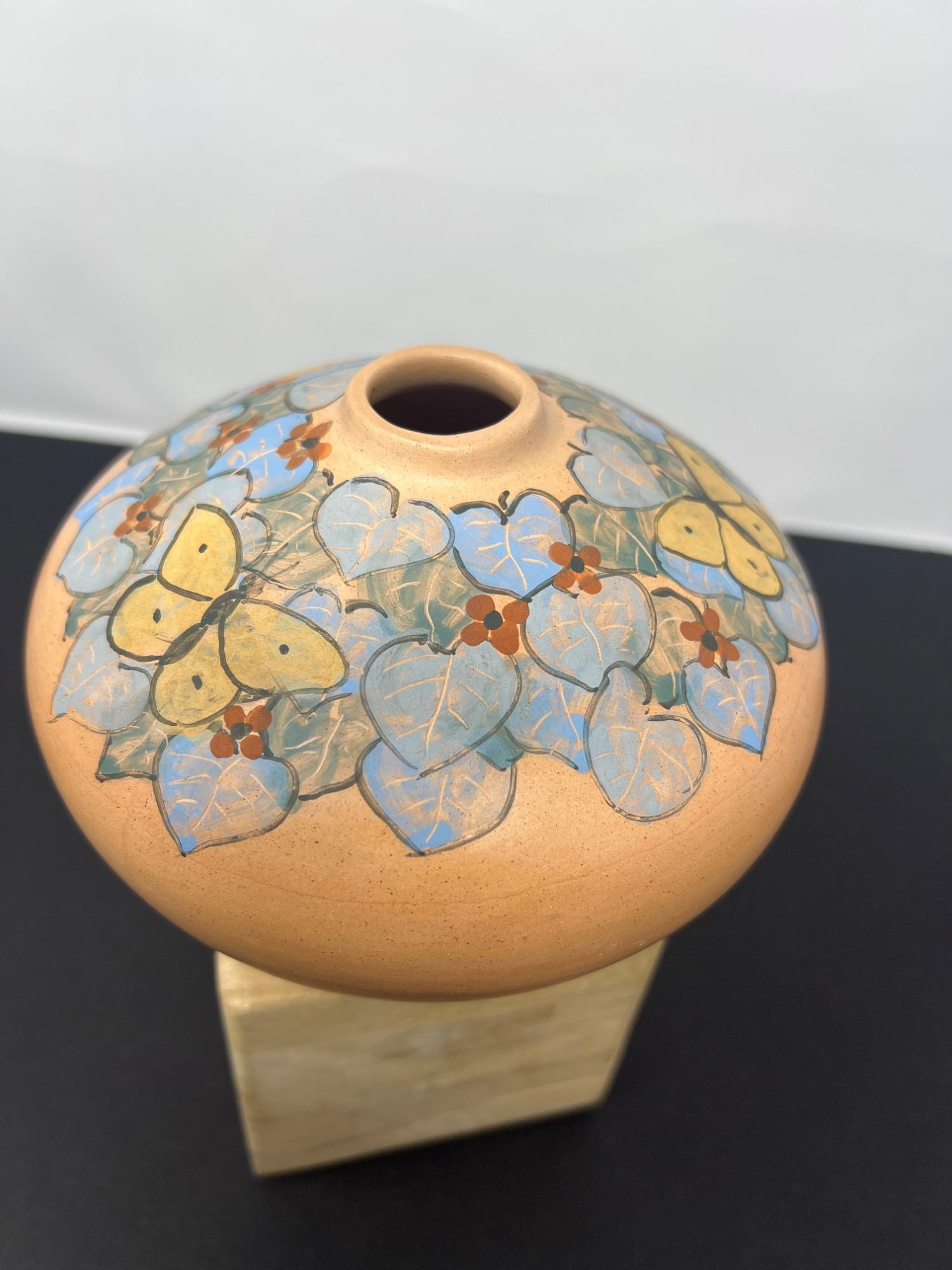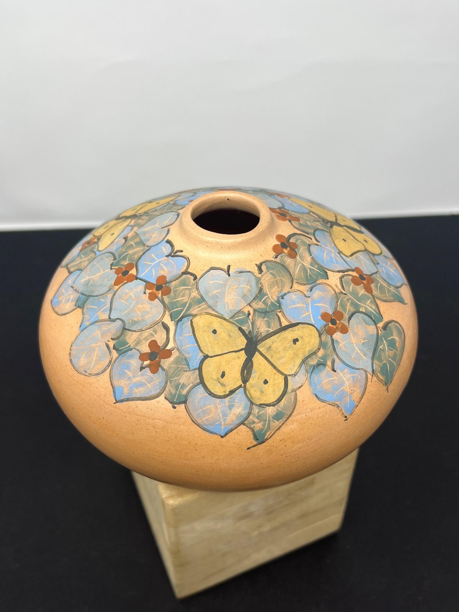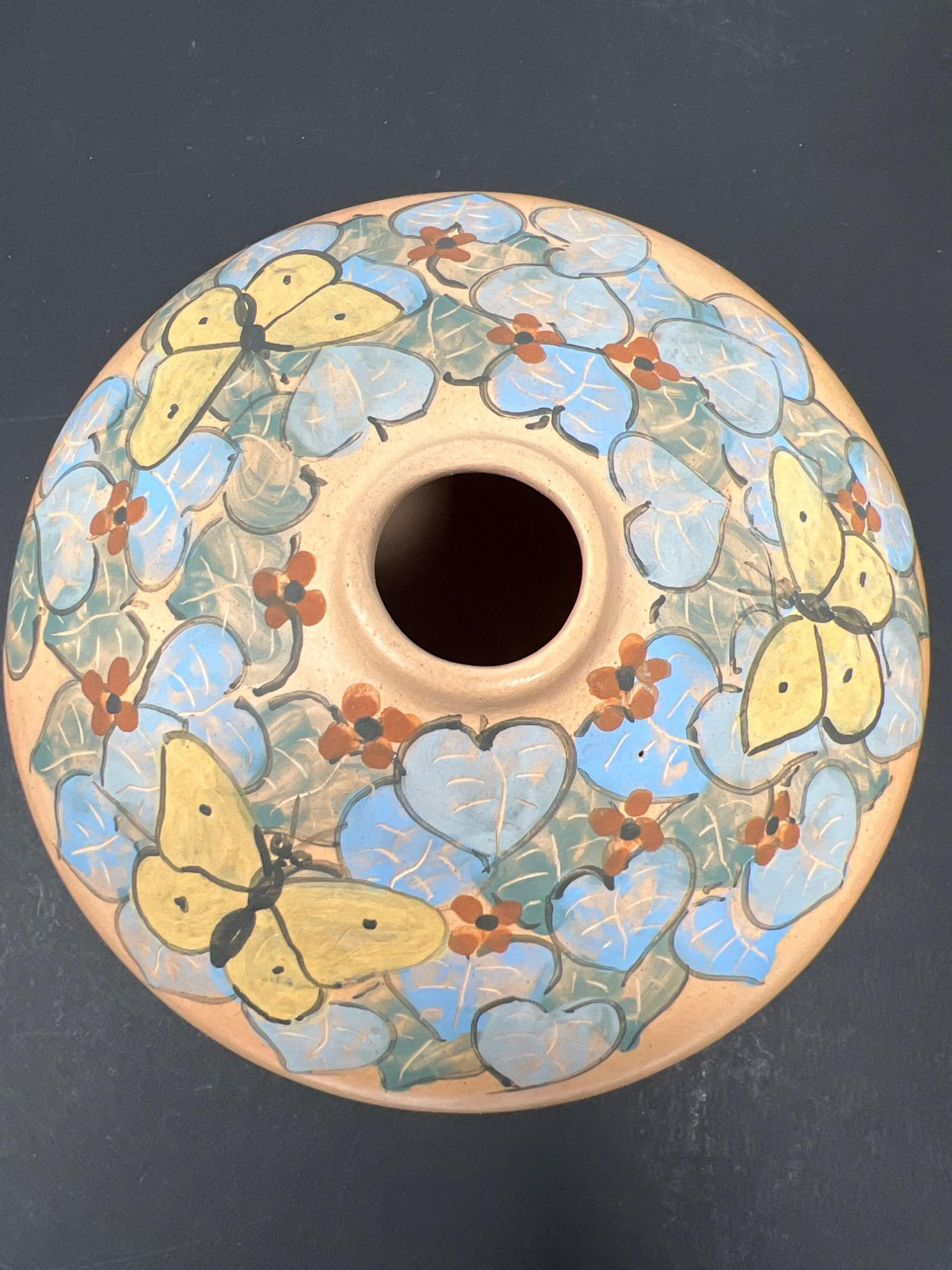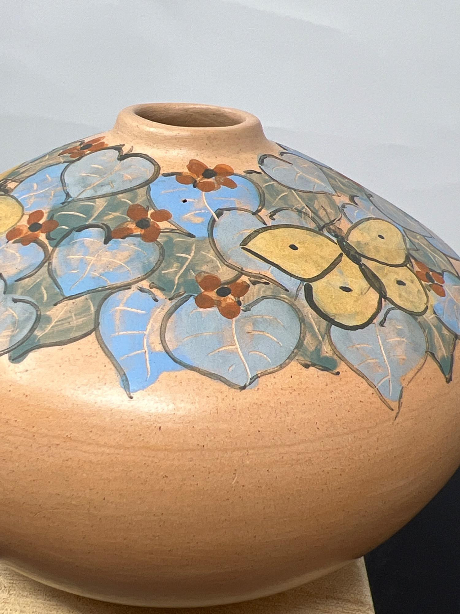 Vintage Santa Cruz, Bolivia, Tiburcio hand painted with blue leaves in the shape of hearts and yellow butterflies onto exquisitely made clay vase. GT