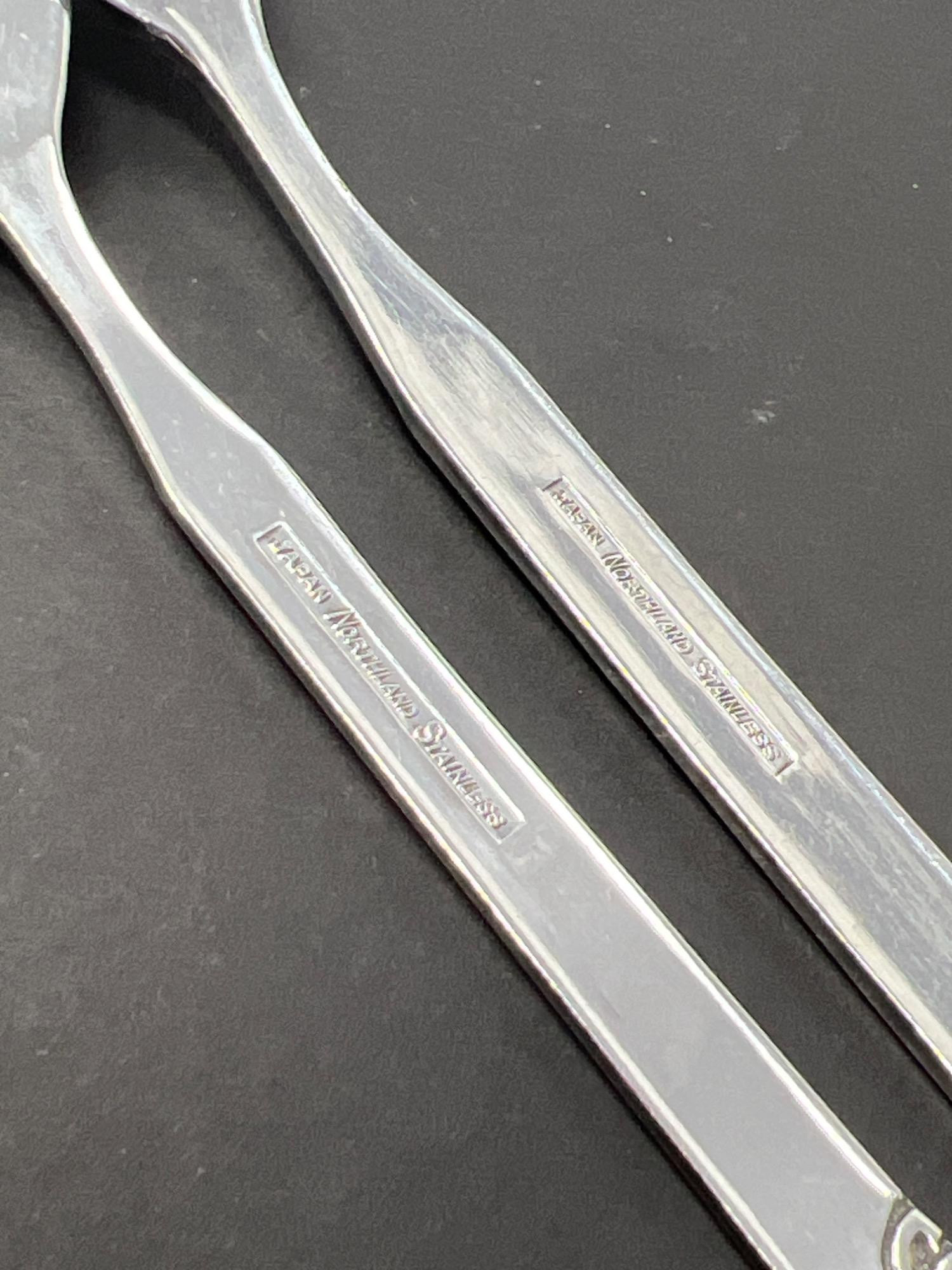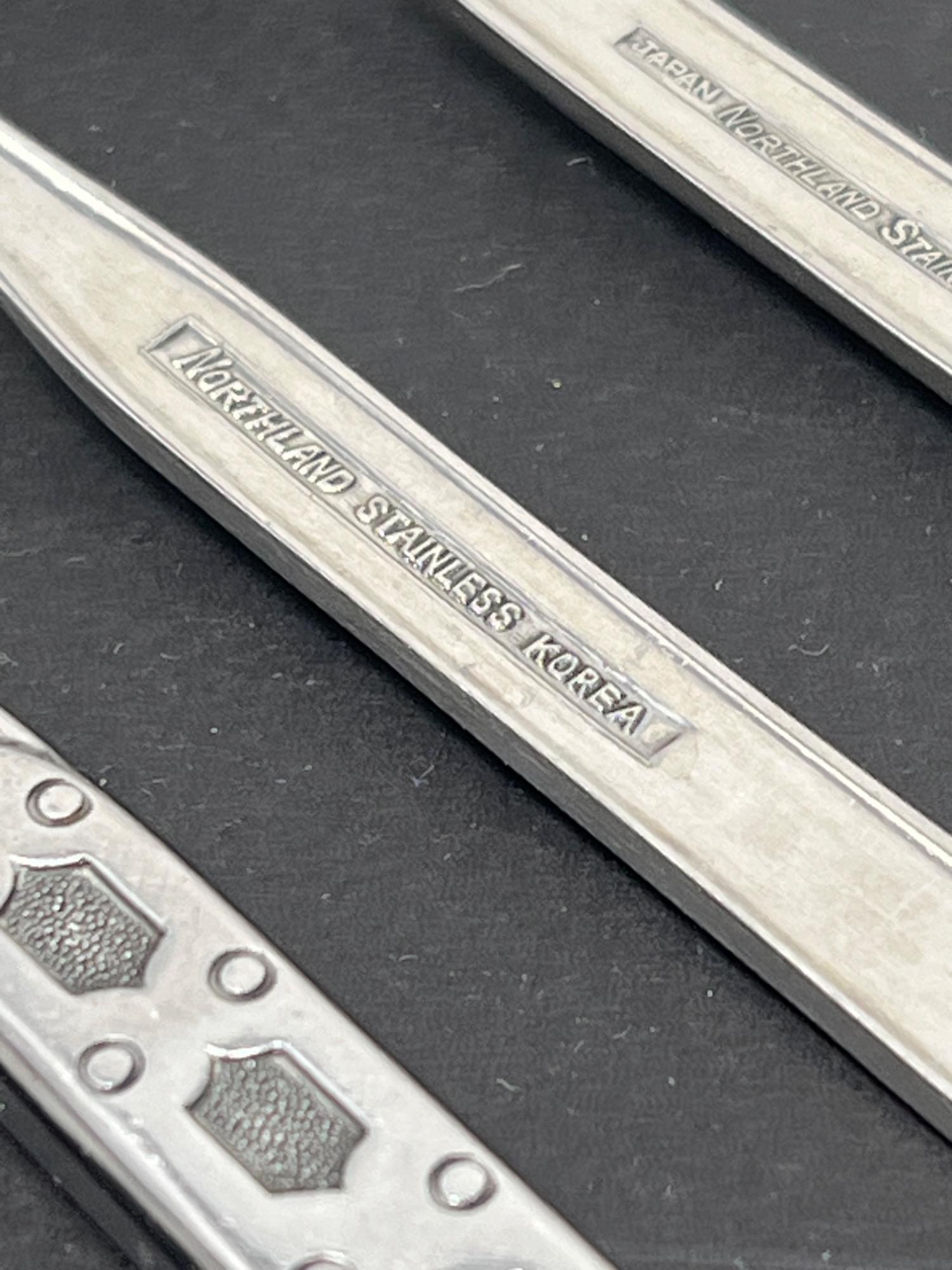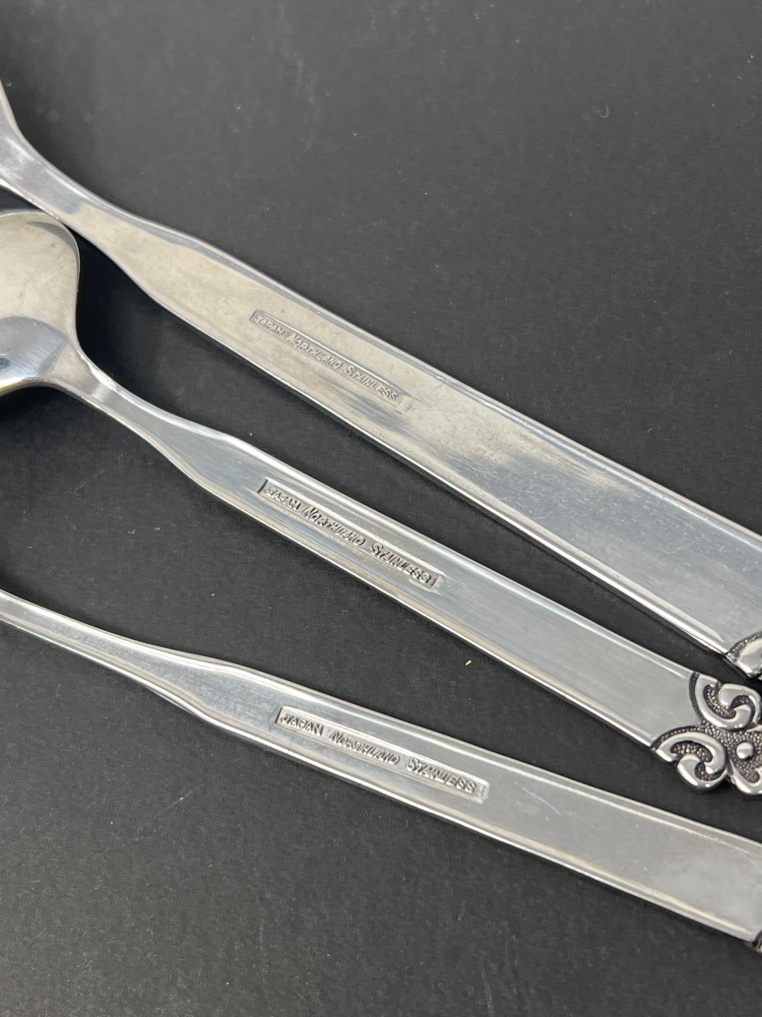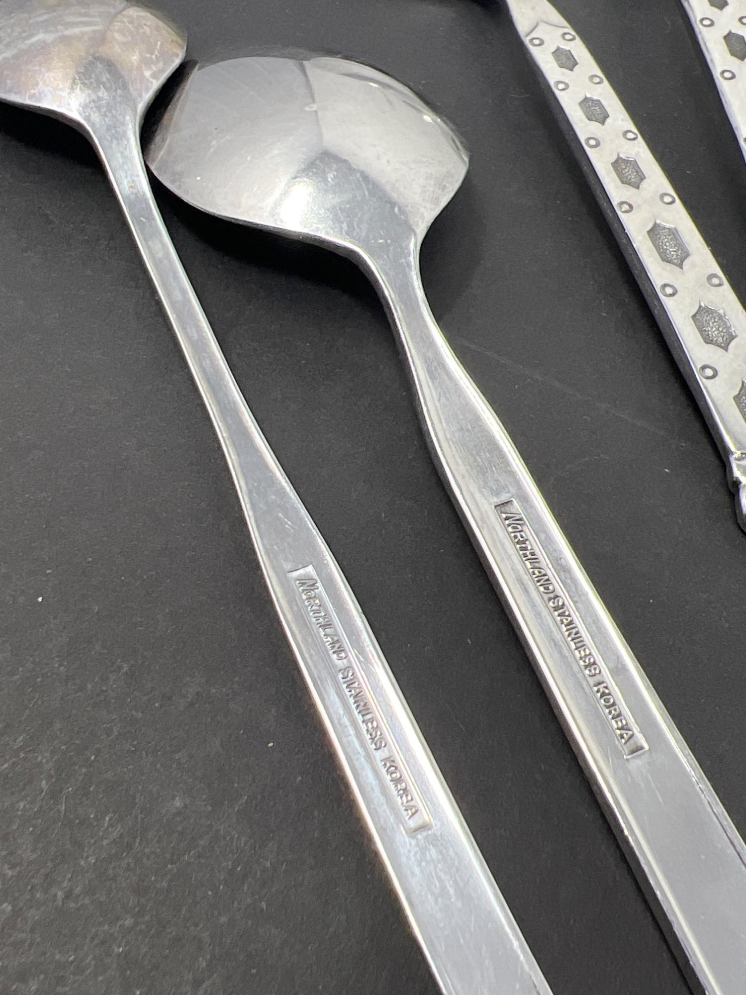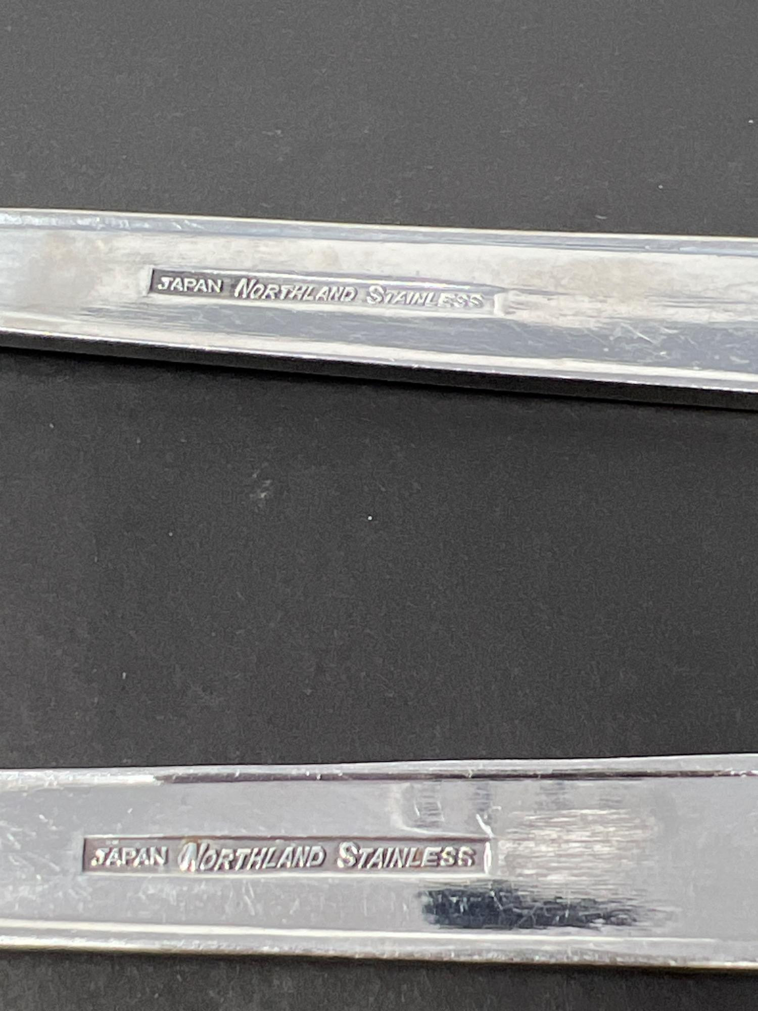 Stainless steel flatware. Dinner forks, salad forks, teaspoons, tablespoons, knives, iced tea spoons and servers including butter knives and sugar spoon. Northland, Japan.