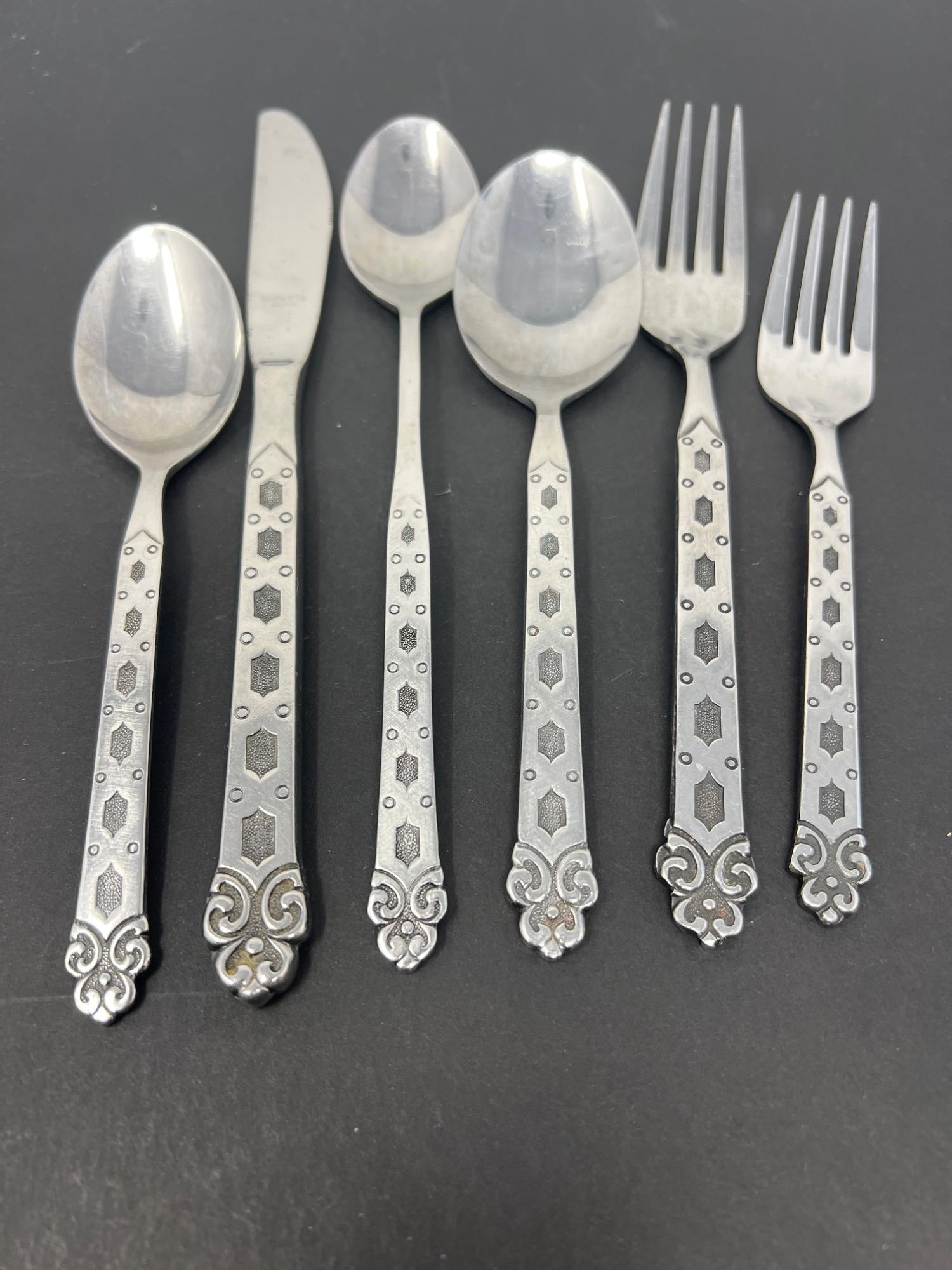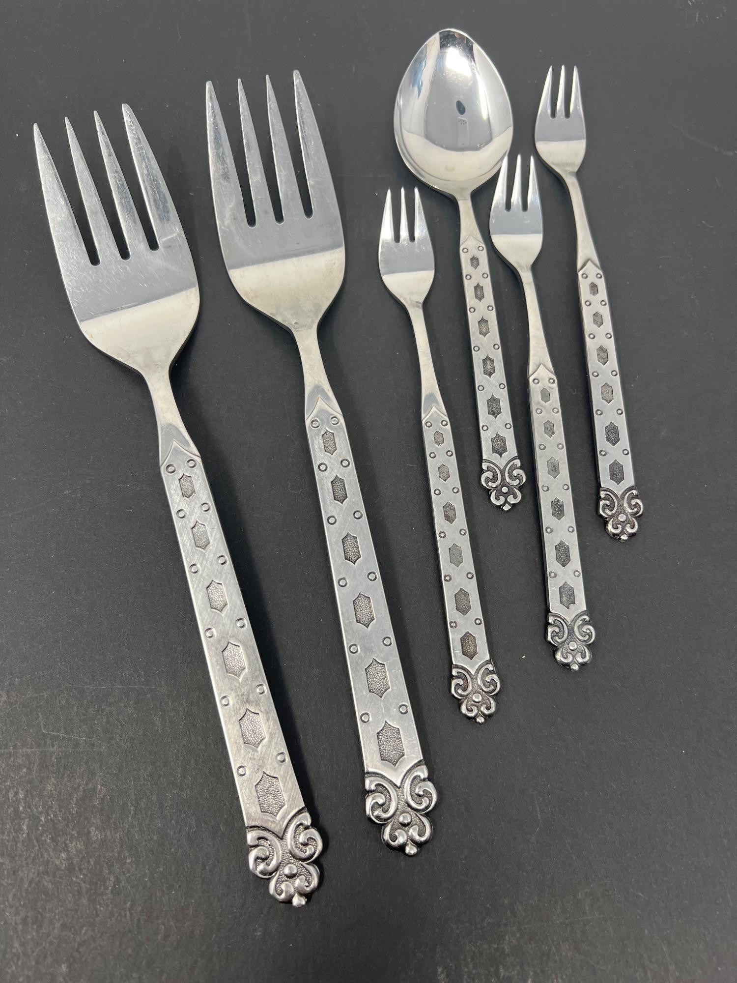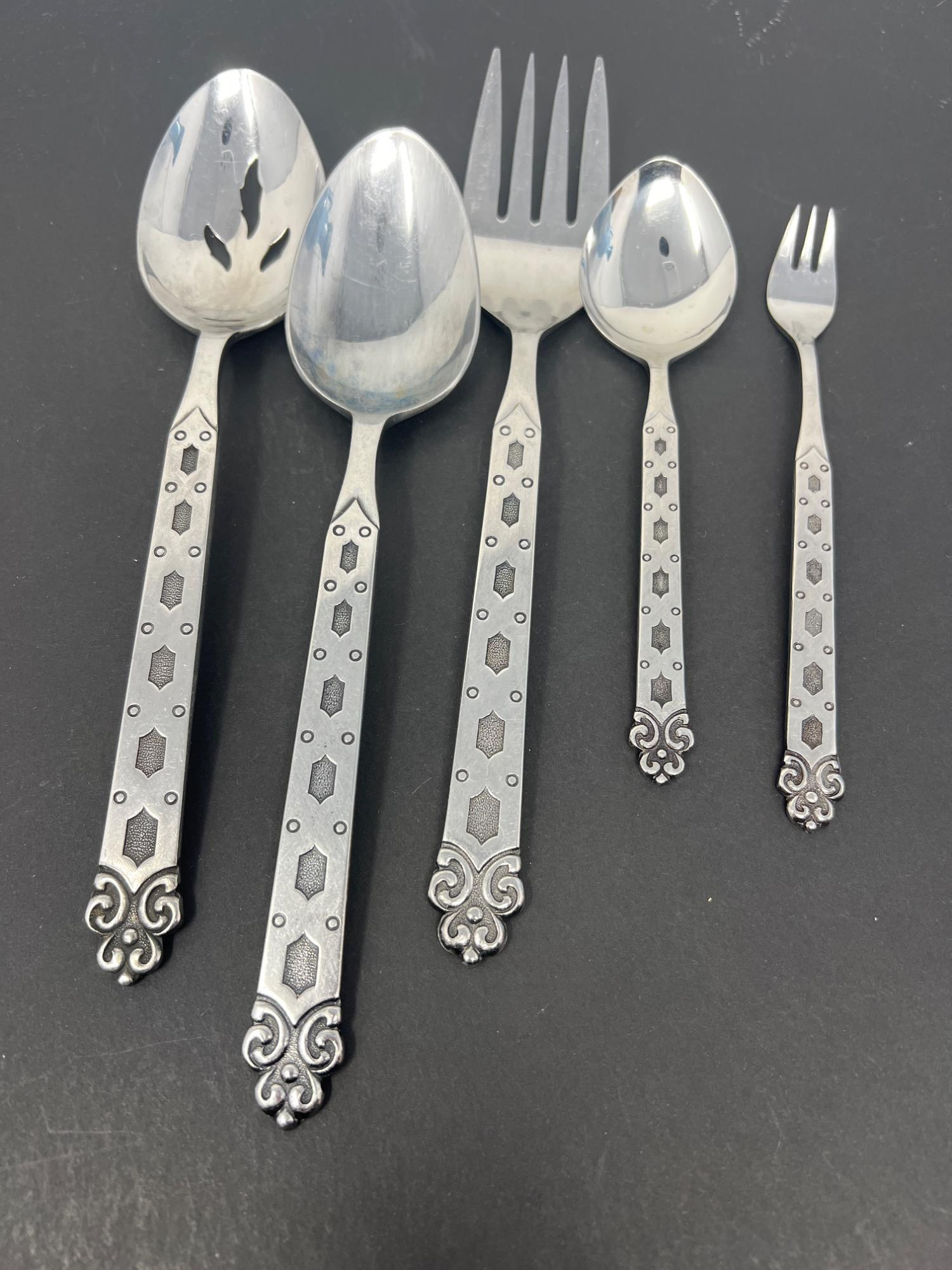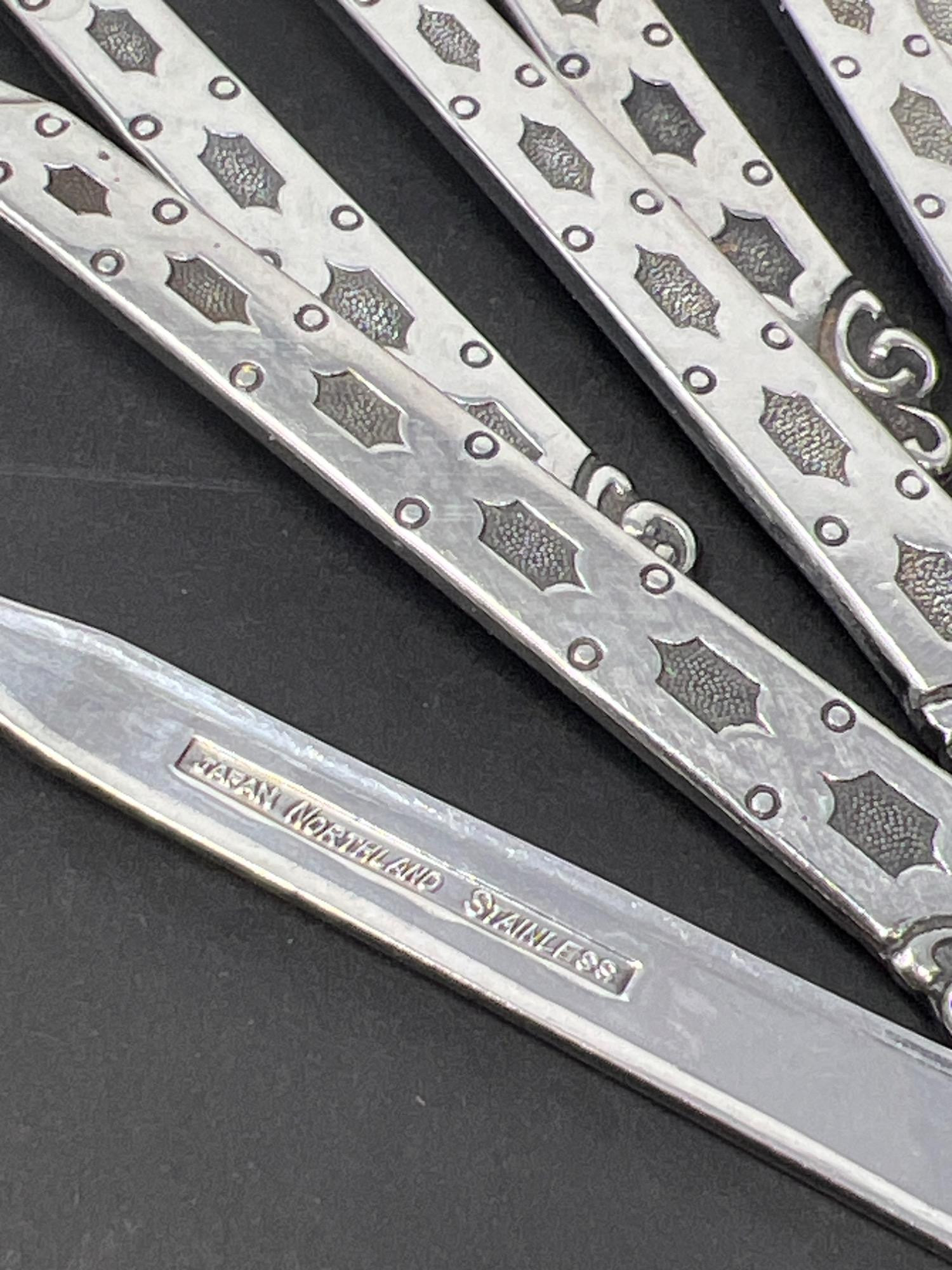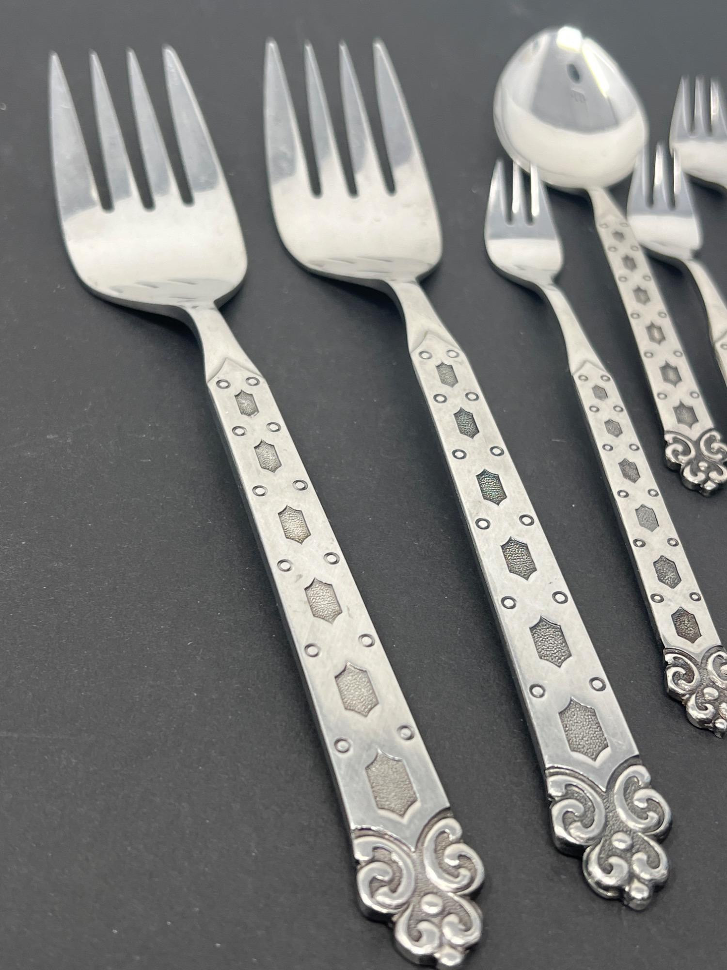 Stainless steel flatware. Dinner forks, salad forks, teaspoons, tablespoons, knives, iced tea spoons and servers including butter knives and sugar spoon. Northland, Japan.