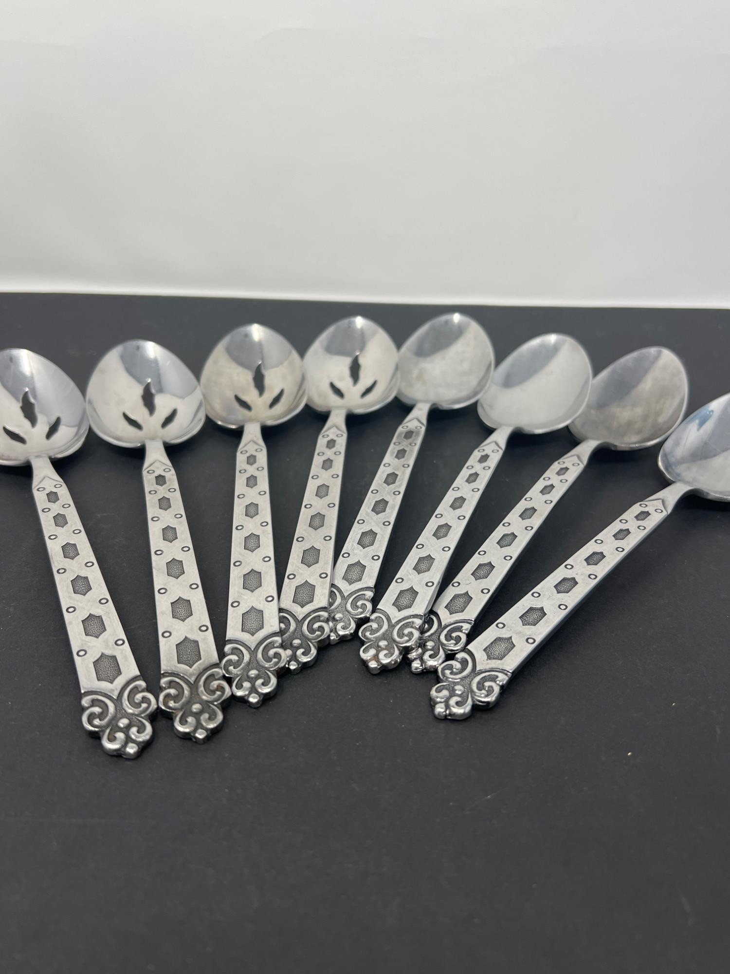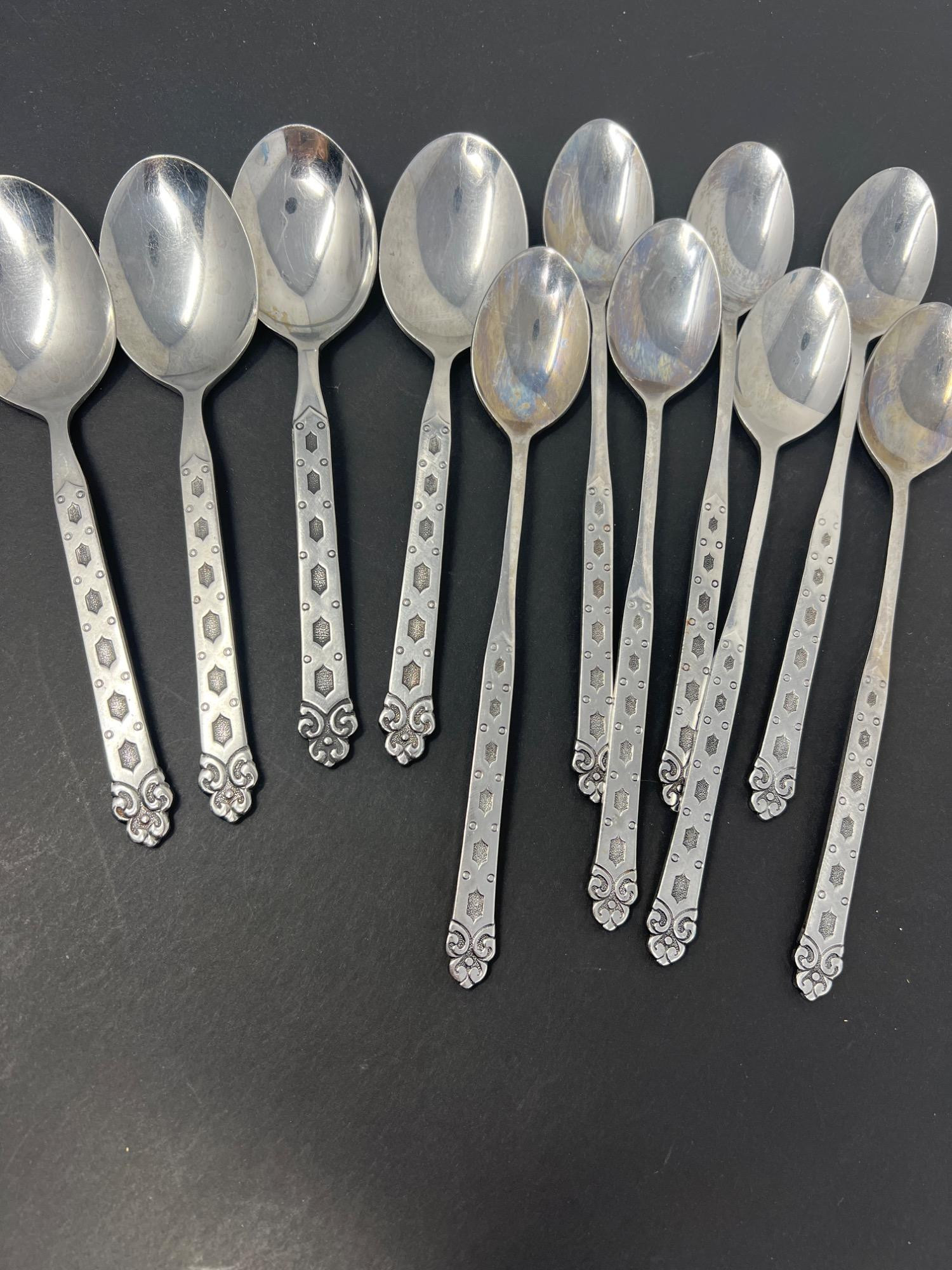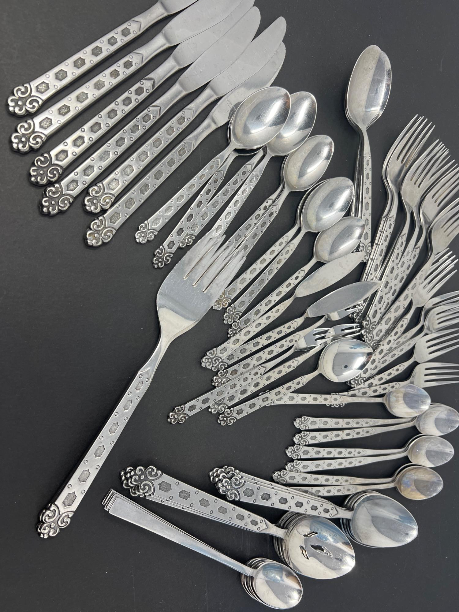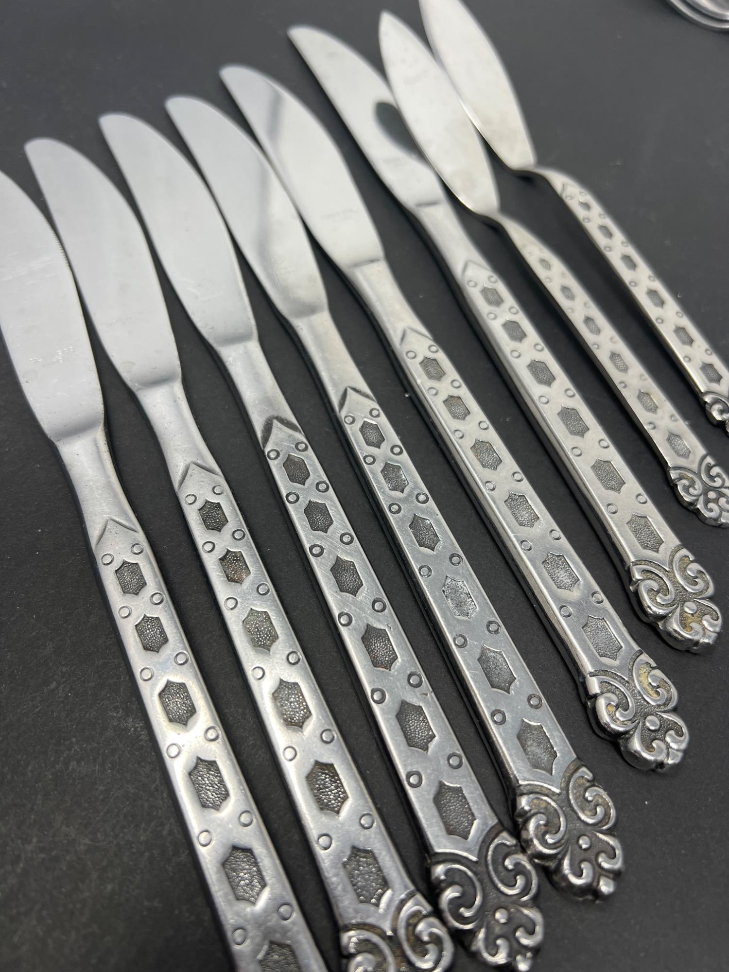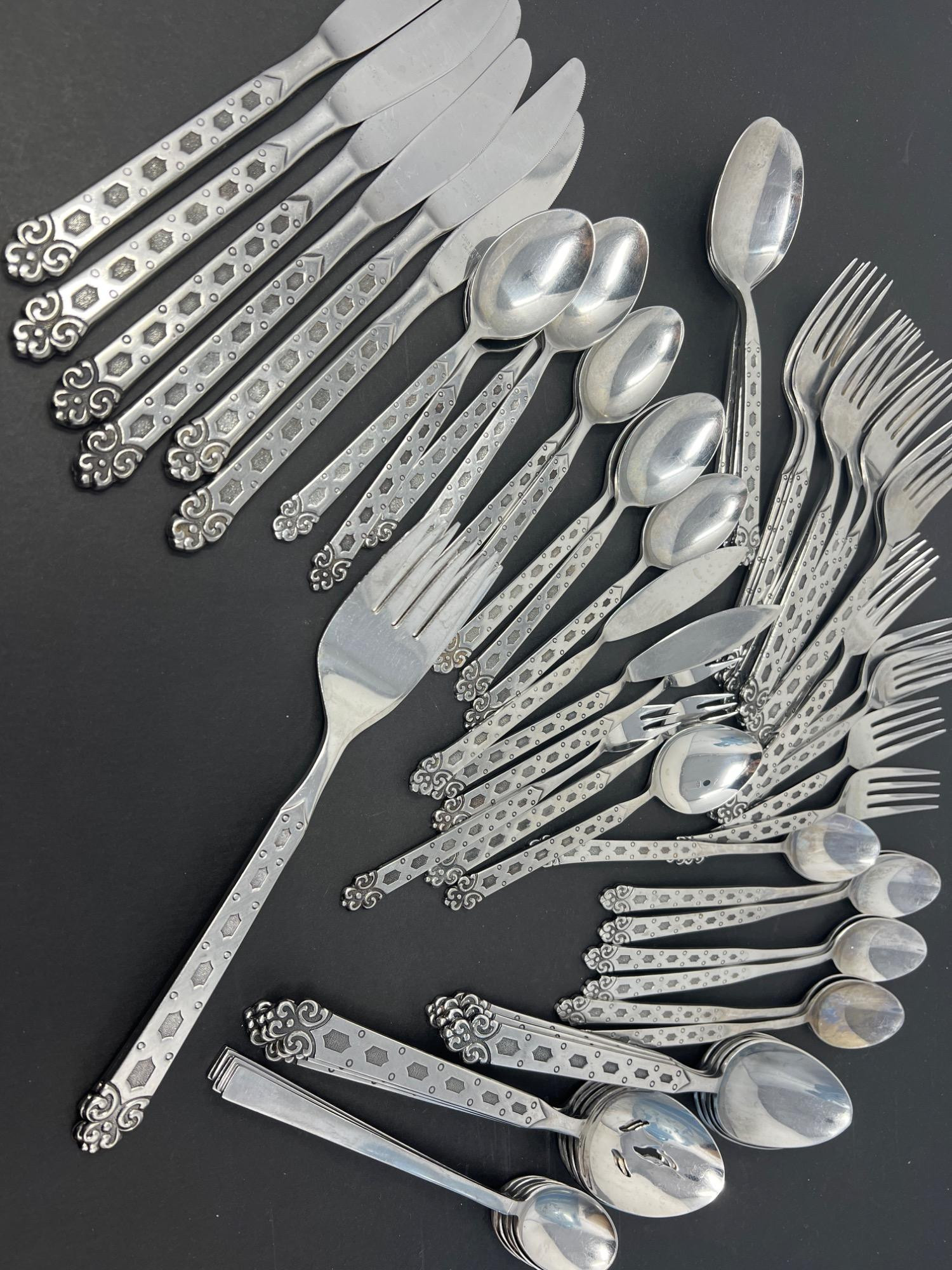 Stainless steel flatware. Dinner forks, salad forks, teaspoons, tablespoons, knives, iced tea spoons and servers including butter knives and sugar spoon. Northland, Japan.
