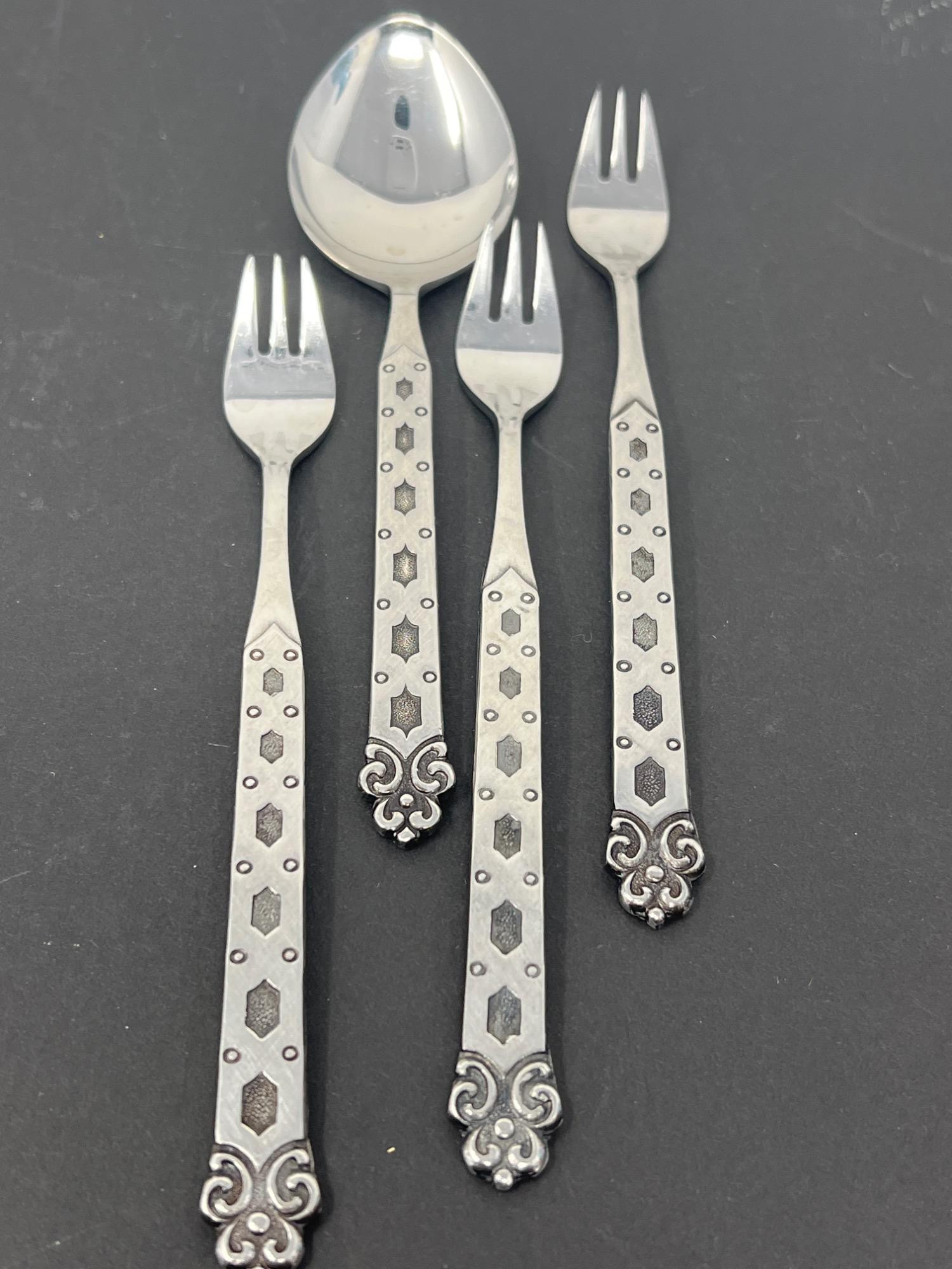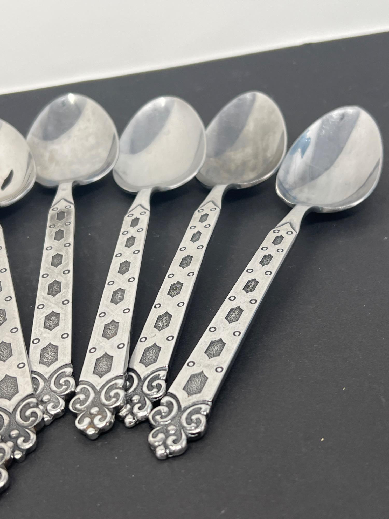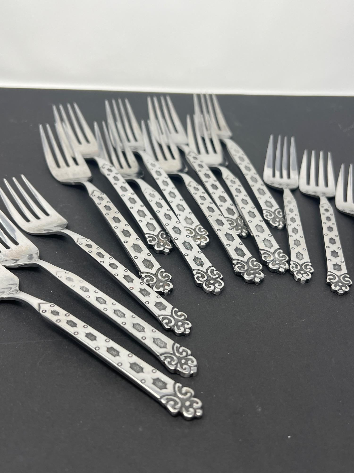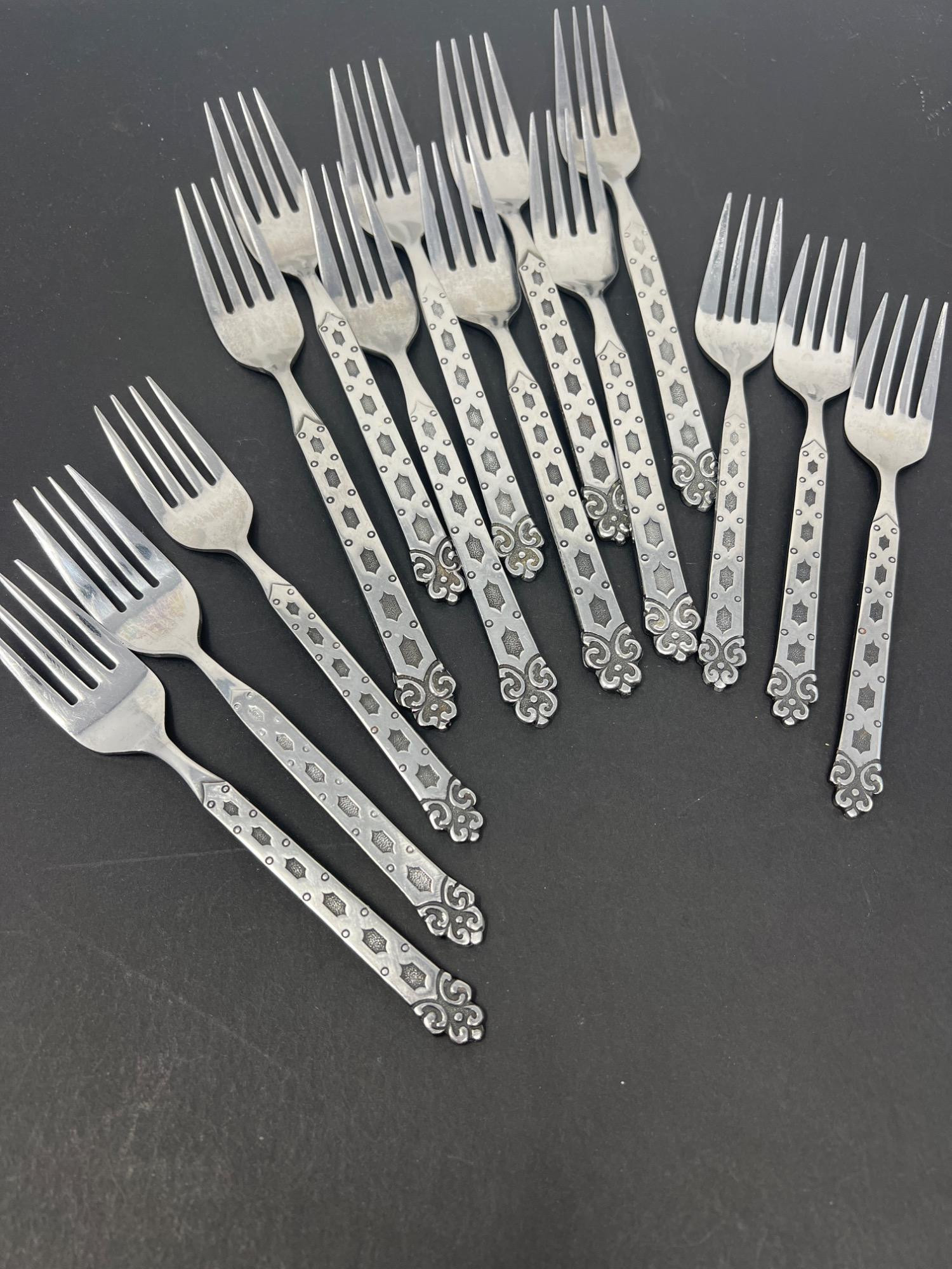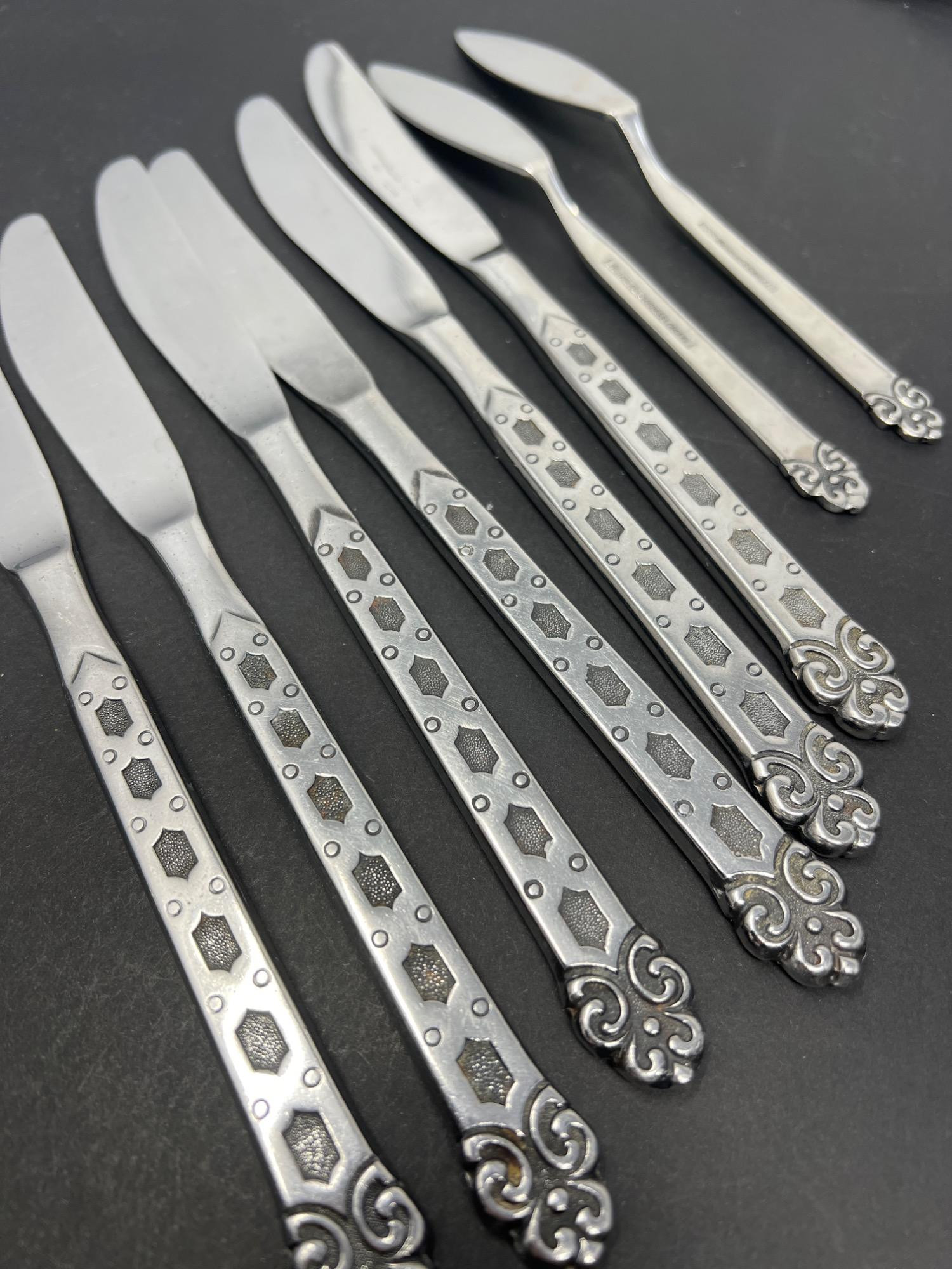 Stainless steel flatware. Dinner forks, salad forks, teaspoons, tablespoons, knives, iced tea spoons and servers including butter knives and sugar spoon. Northland, Japan.