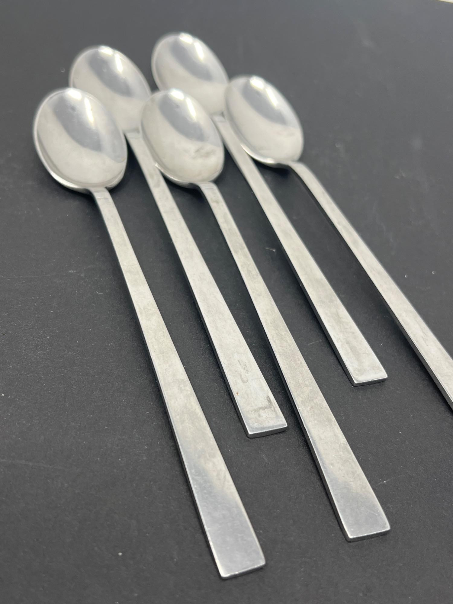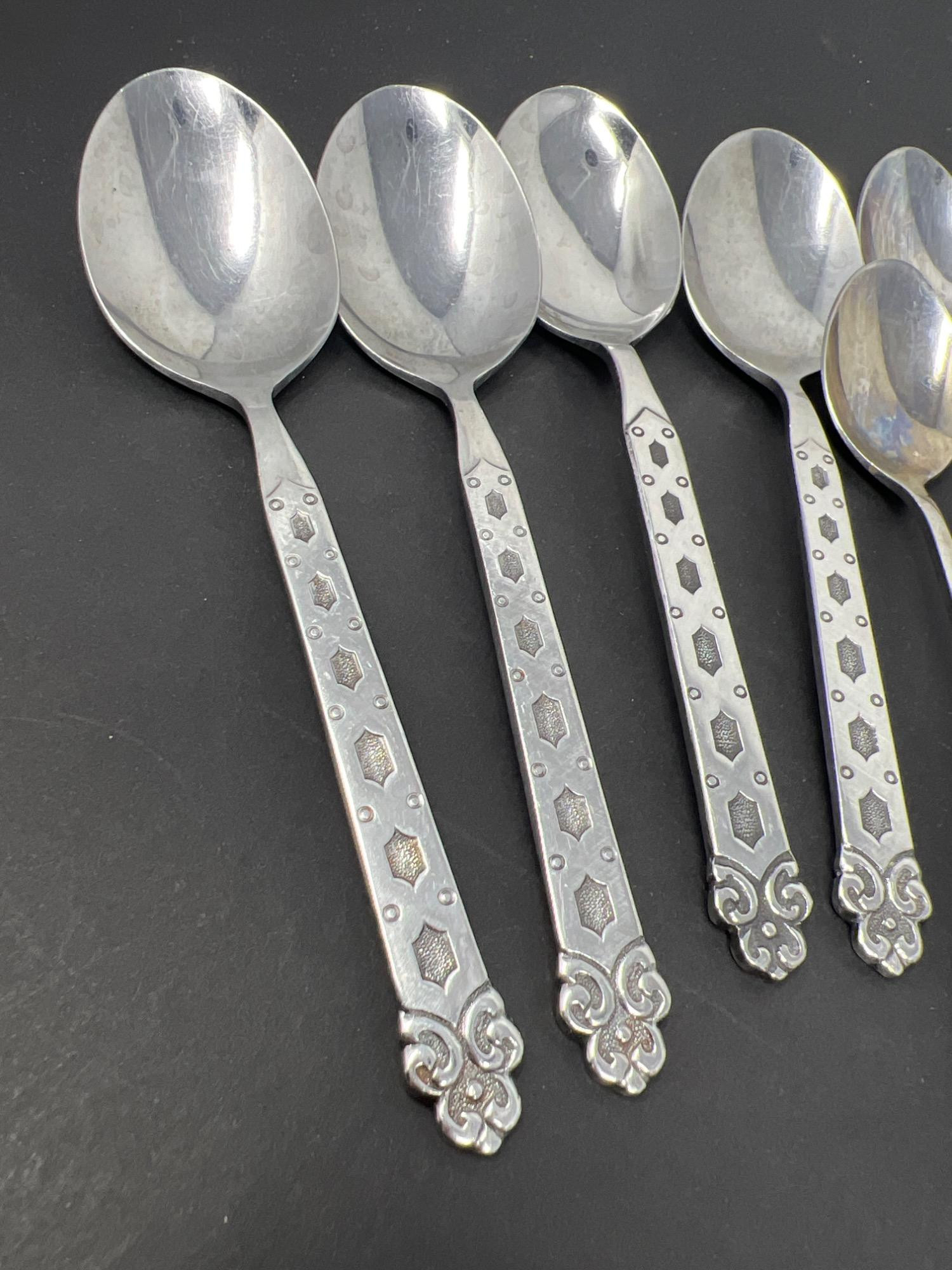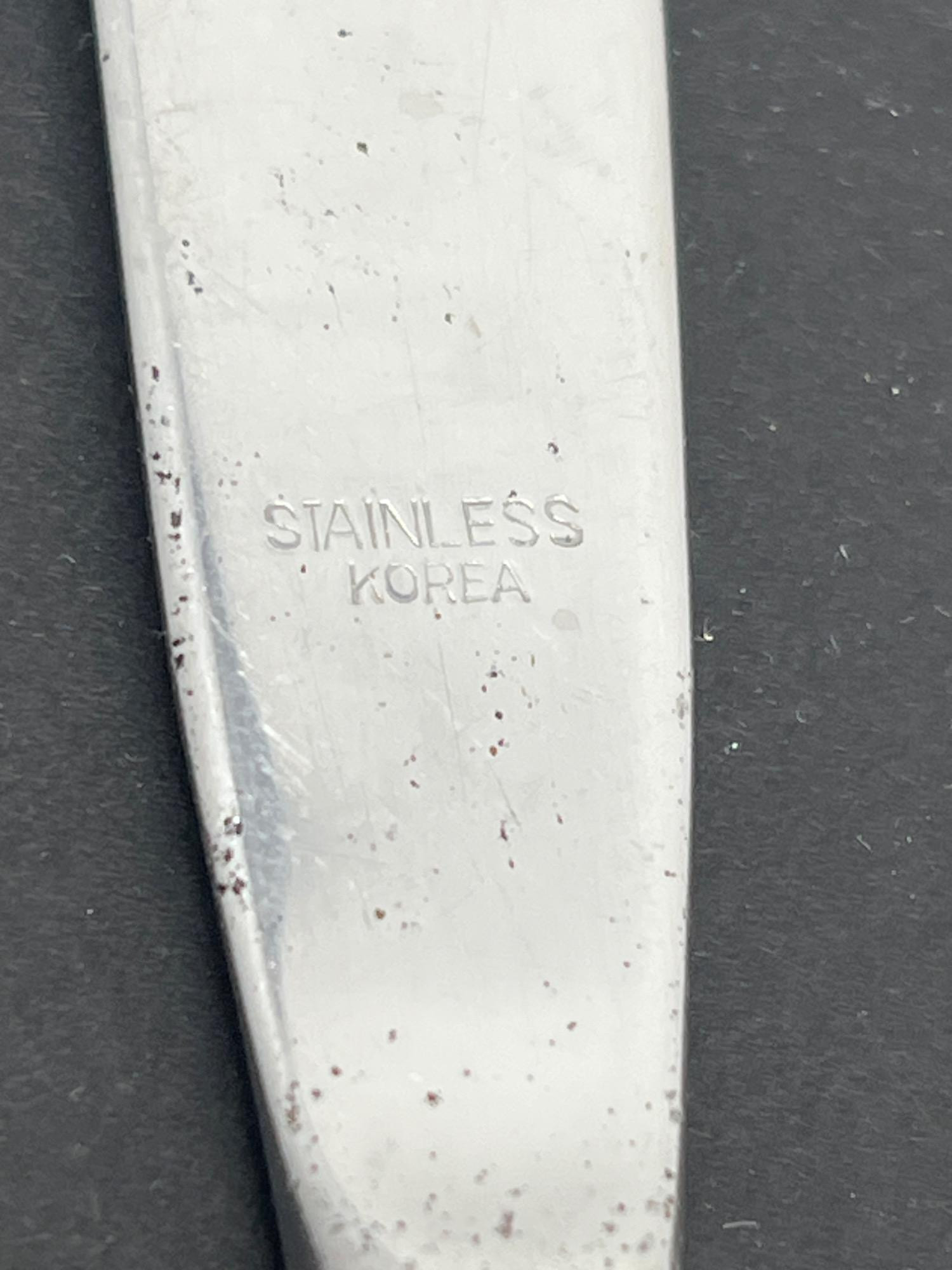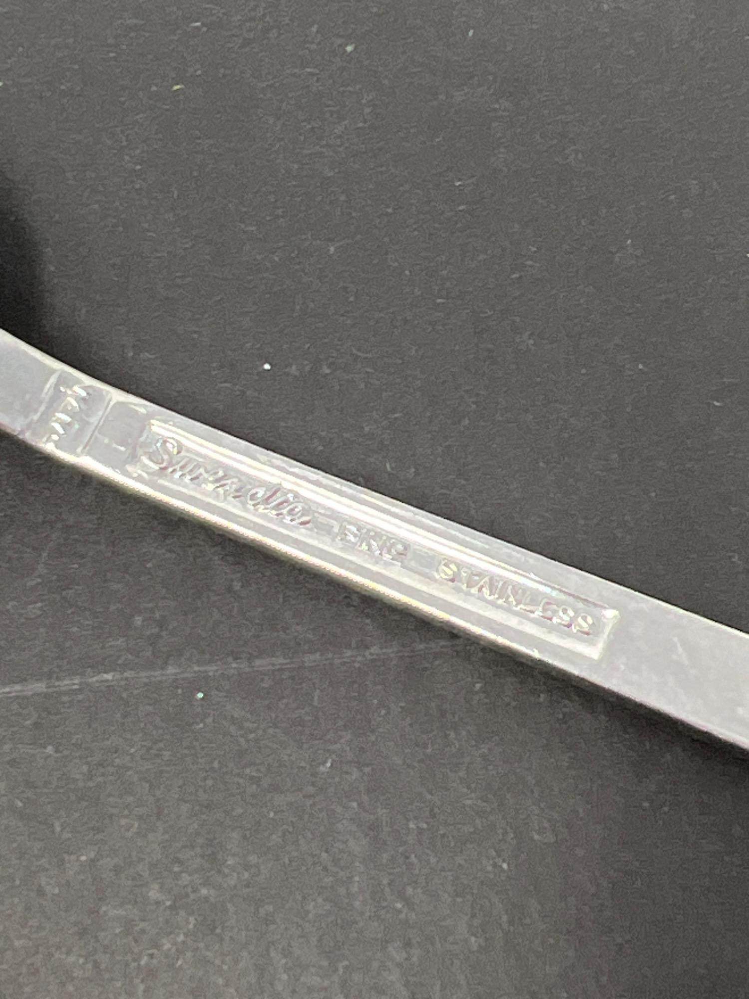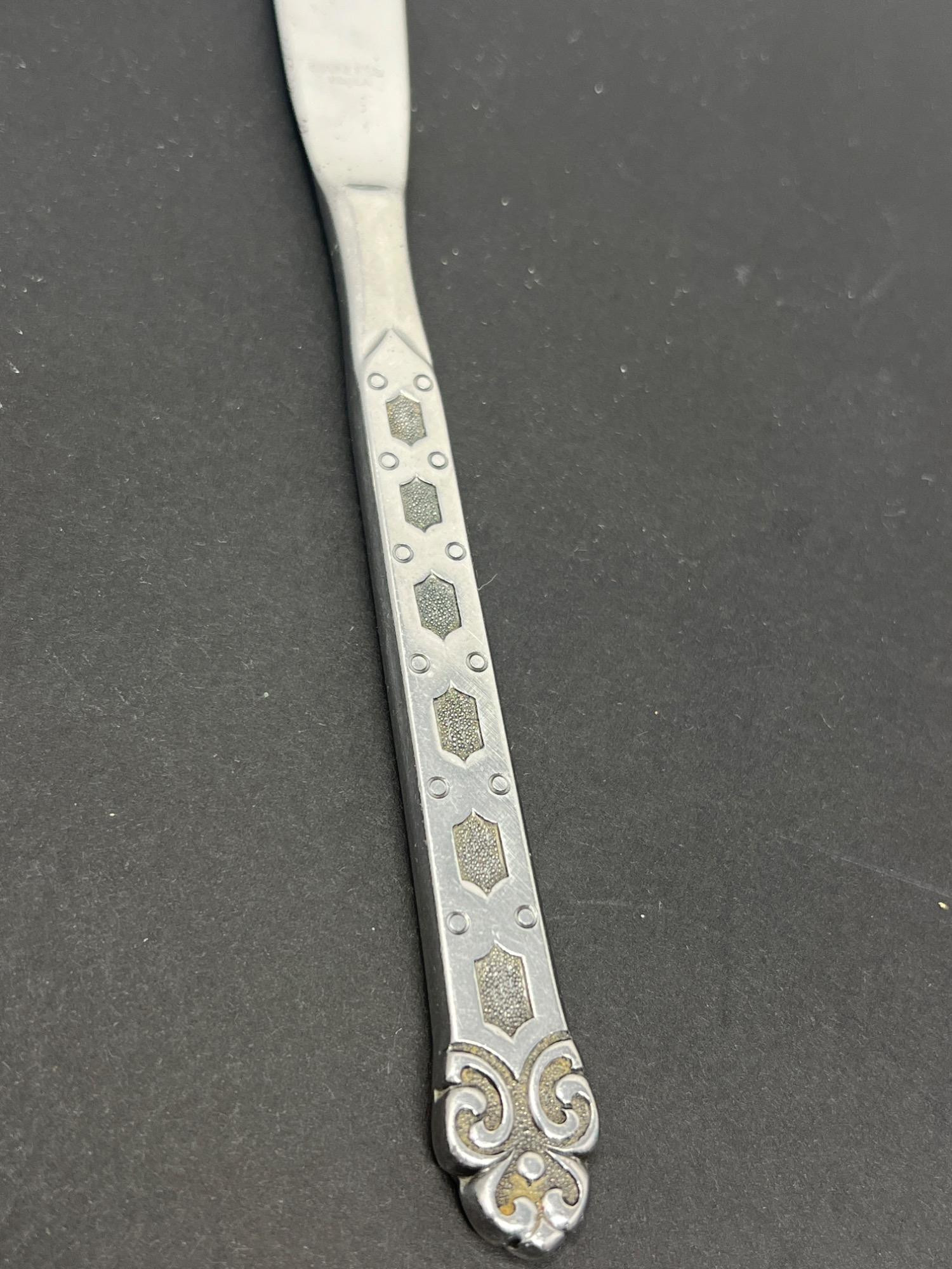 Stainless steel flatware. Dinner forks, salad forks, teaspoons, tablespoons, knives, iced tea spoons and servers including butter knives and sugar spoon. Northland, Japan.