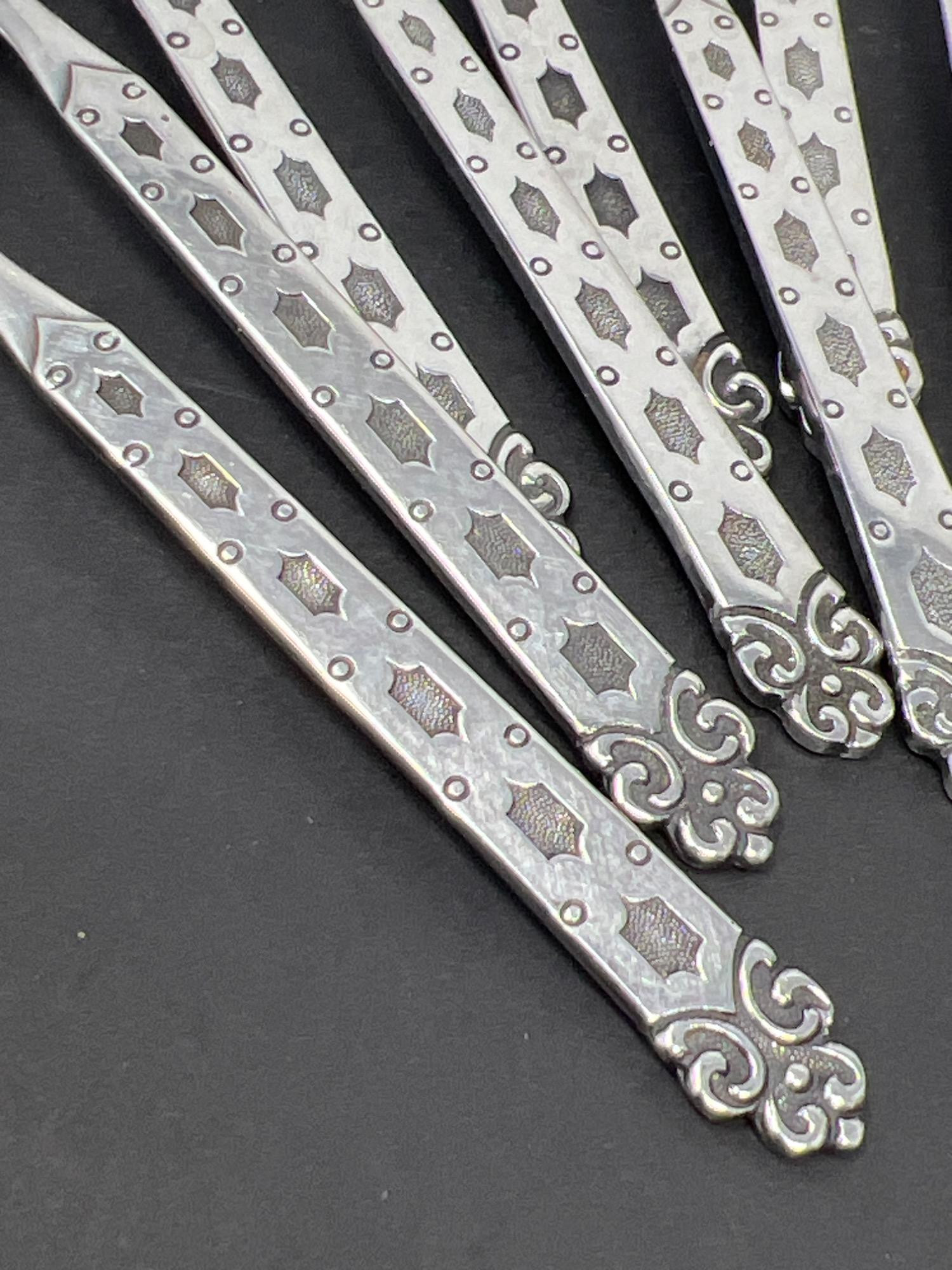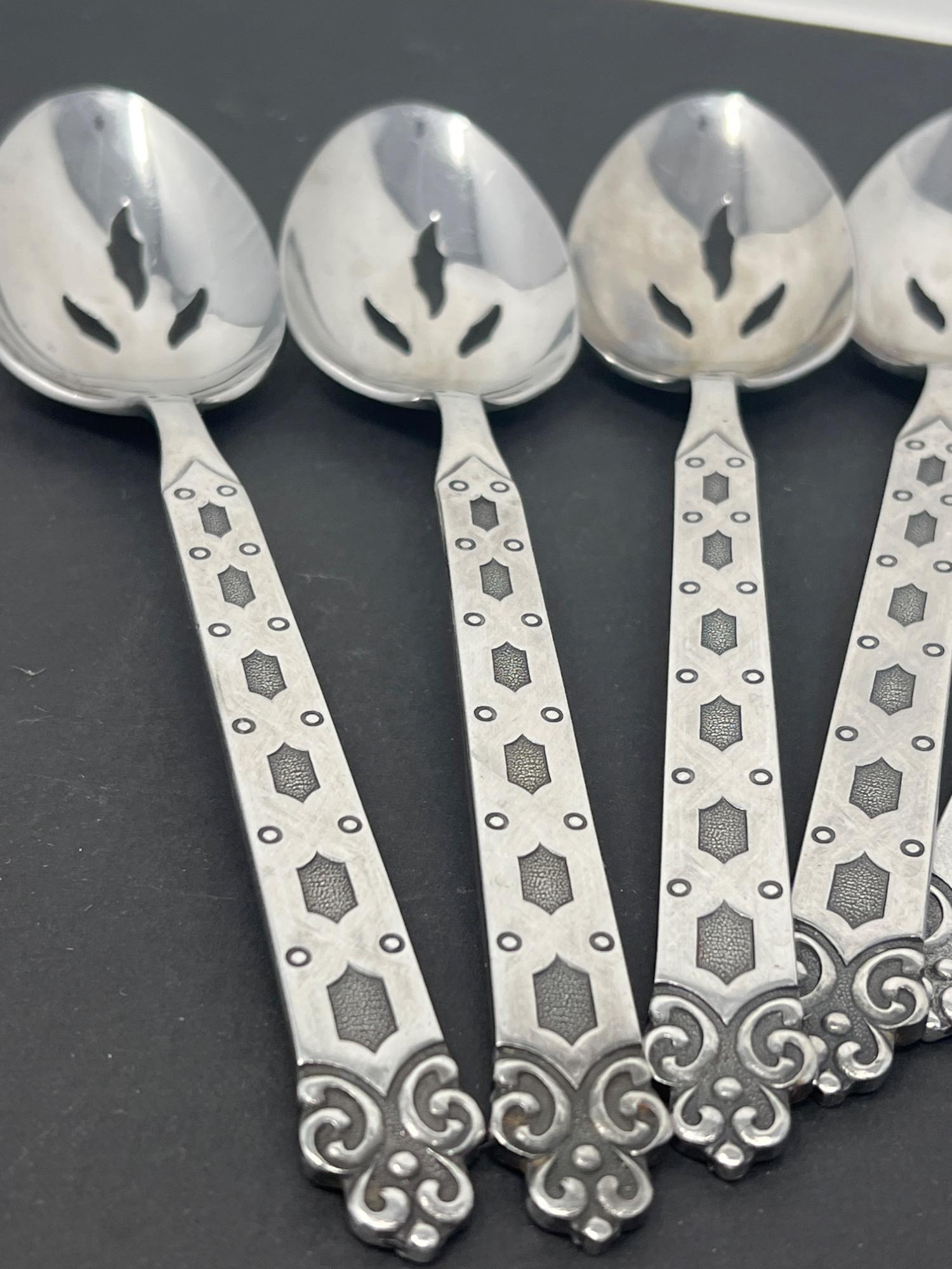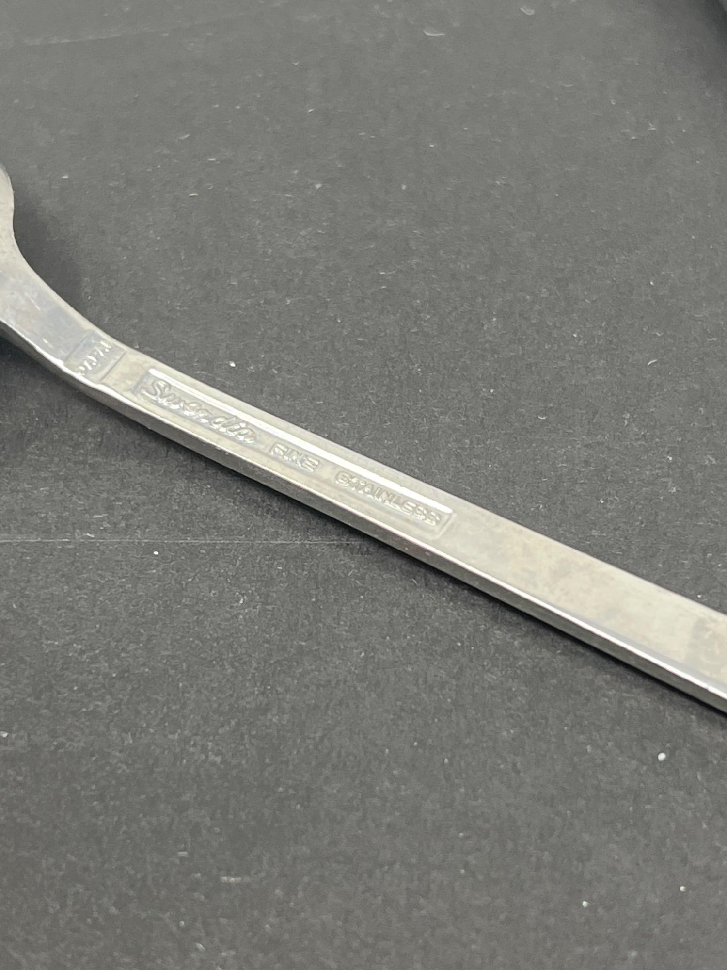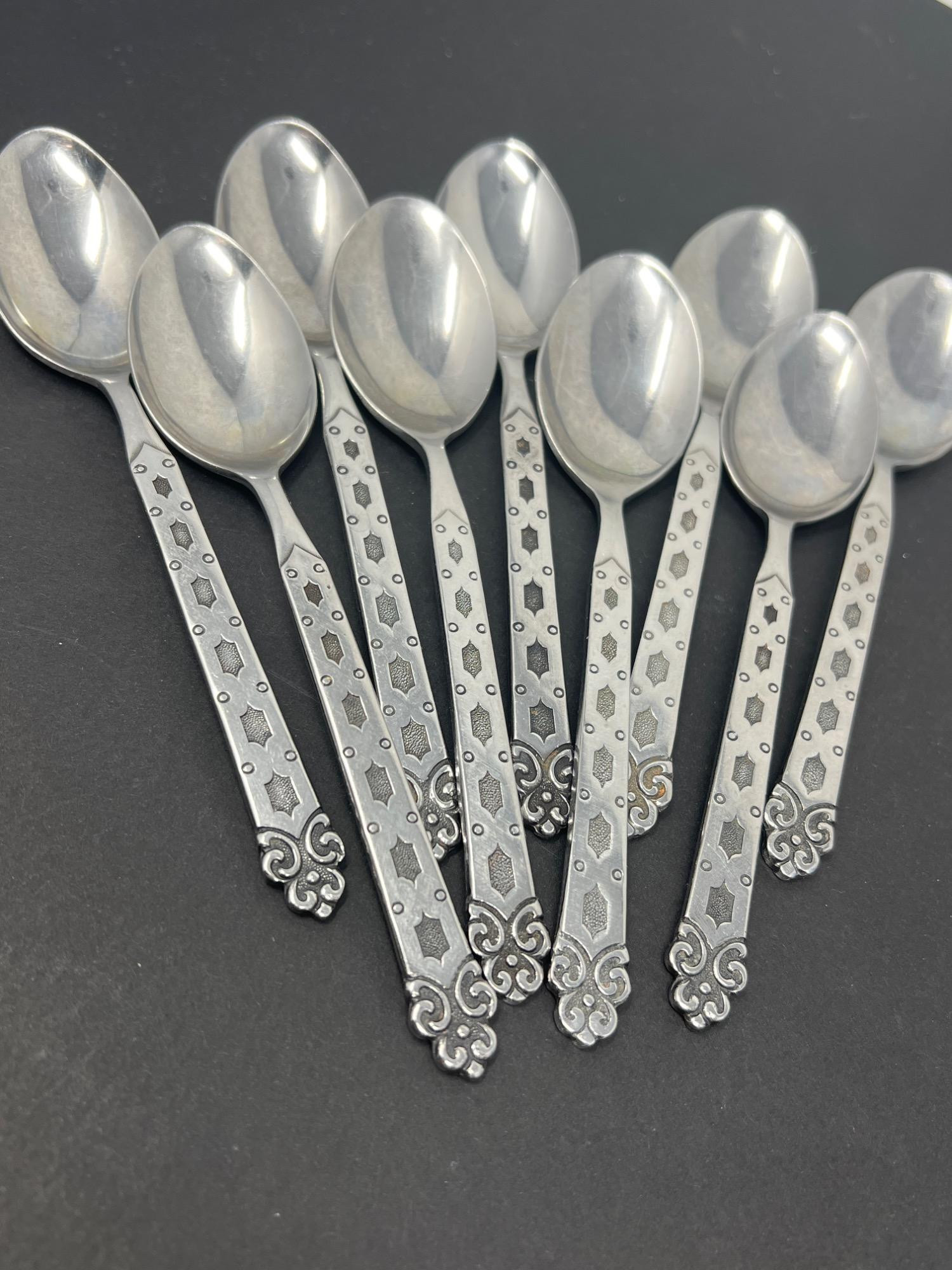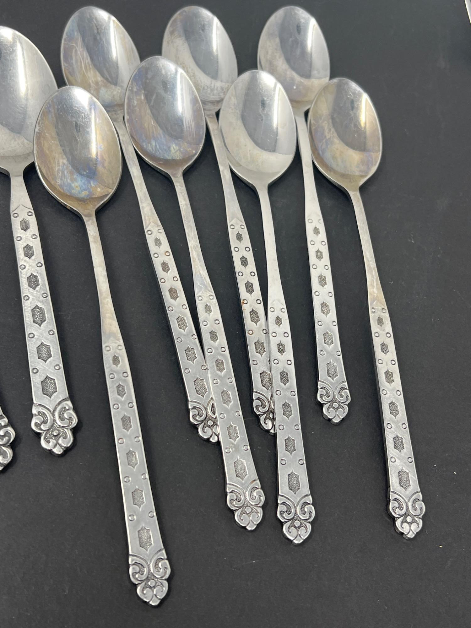 Stainless steel flatware. Dinner forks, salad forks, teaspoons, tablespoons, knives, iced tea spoons and servers including butter knives and sugar spoon. Northland, Japan.