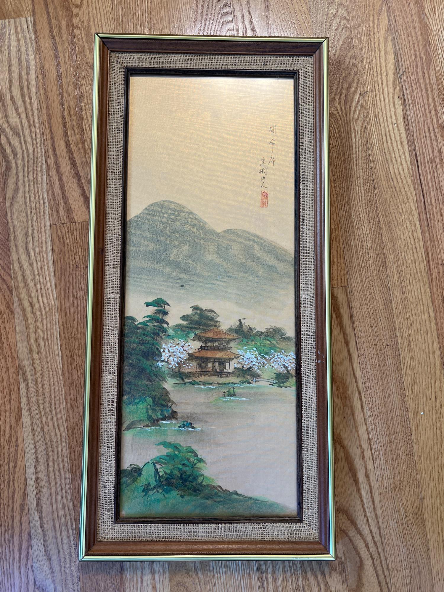 Appears to be a painting on silk, mounted on board and framed. Potentially a temple in old Kyoto, Japan. Vintage frame.