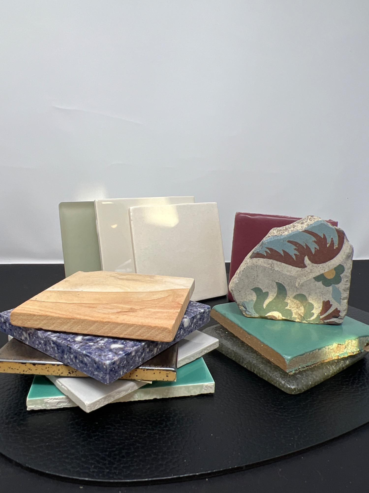 Tiles converted to tabletop coasters or use as craft material. Painted smooth cement or pumice rock. Glass tiles. CAP