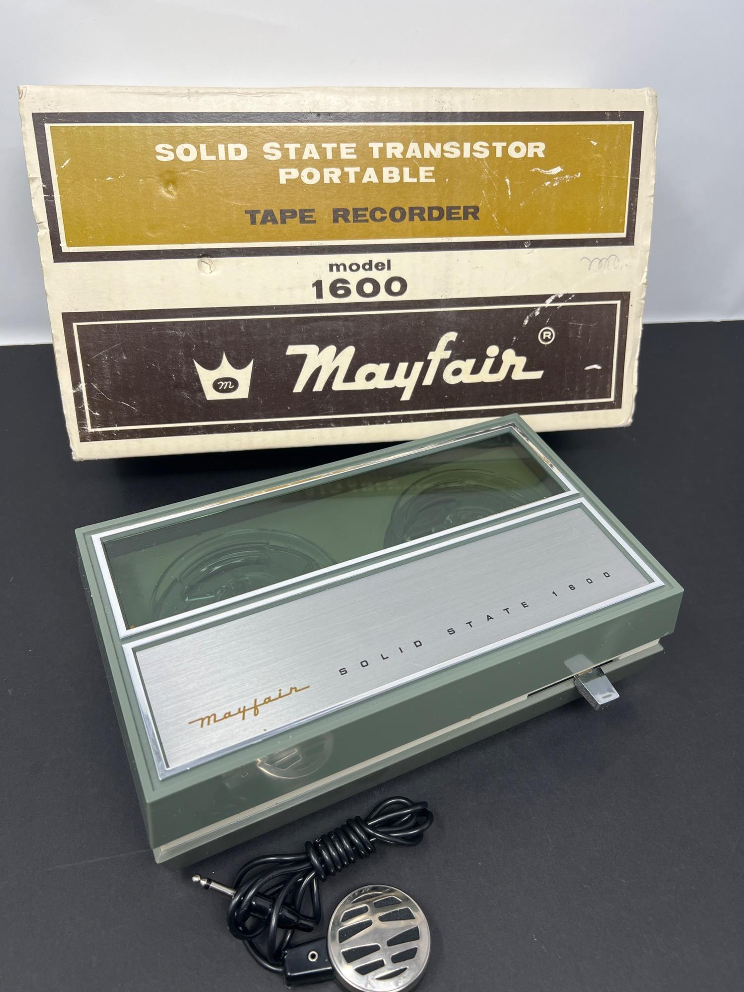 Vintage reel-to-reel tape recorder with microphone. Model 1600. Operates with battery. When tested - machine operates in play, but appears to be unresponsive in reverse. No actual tape available to test further. CRL