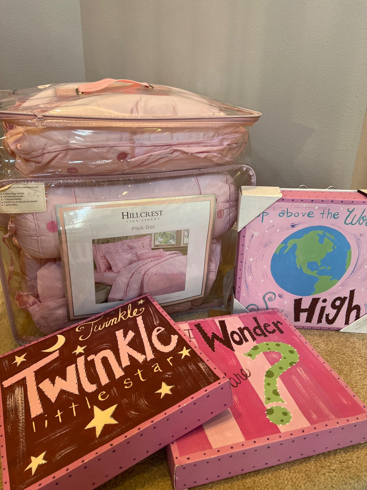 Like new twin bedspread, shams, bedskirt, and head rest pillow. Hillcrest’s Pink Dot design. Three inspirational hanging wall art 12 x 12 squares. One still in box. SN